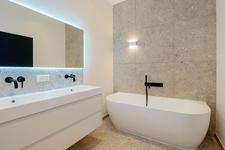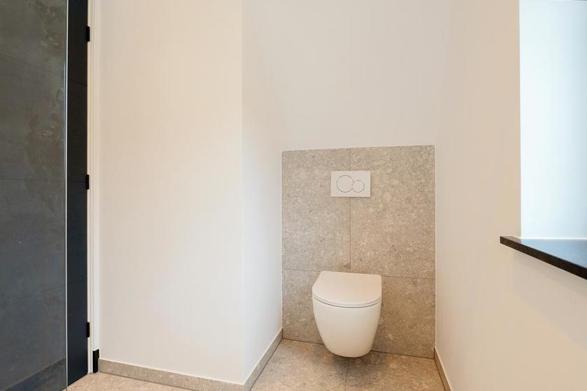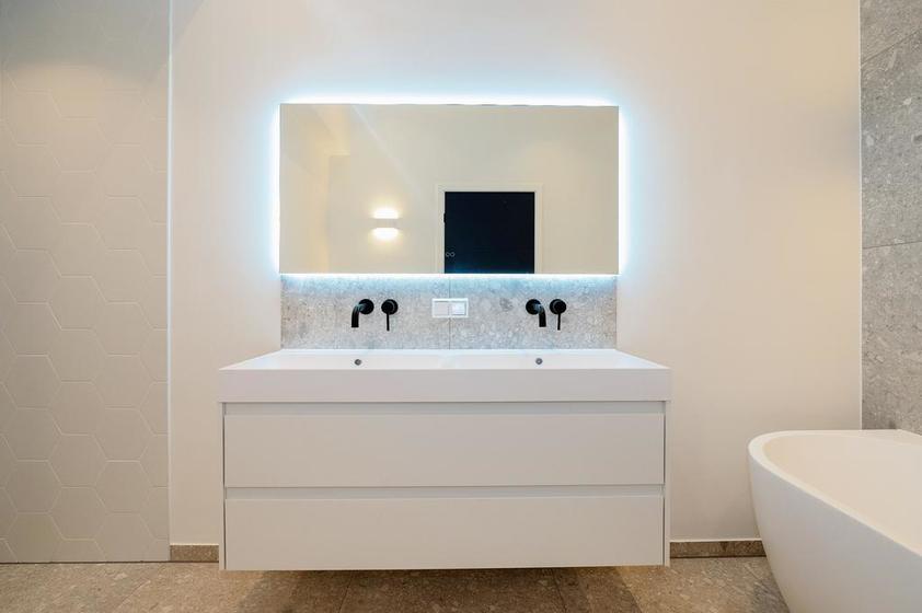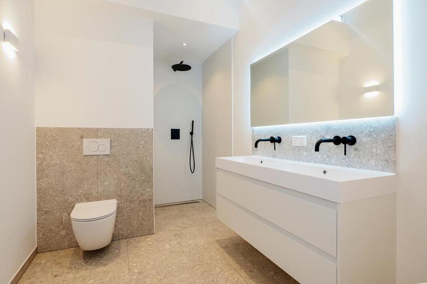 BADKAMER De badkamer is verrassend groot en stijlvol ingericht met mooie vloer- en wandtegels en voorzien van een wandcloset, een meubel met twee wastafels, een spiegel, een ligbad en een inloopdouche. En heel prettige: het dakraam zorgt voor natuurlijk daglicht.