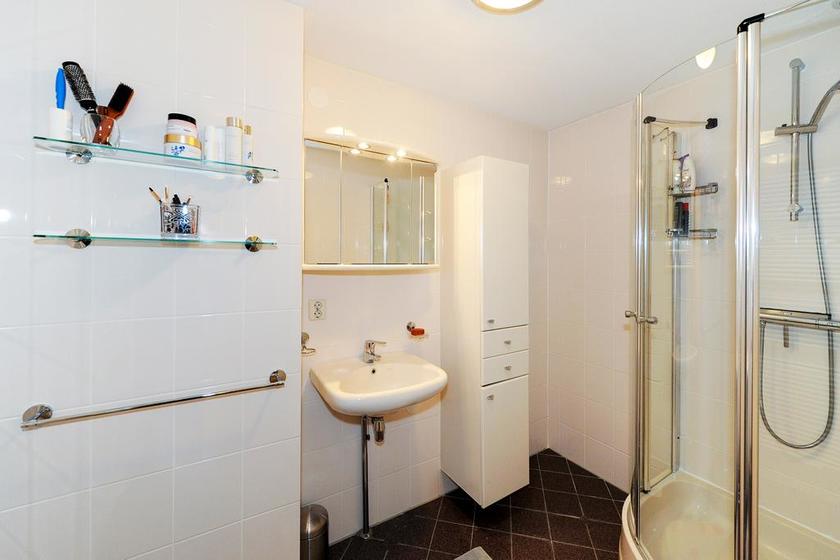 De BADKAMER is eigentijds ingericht met een douchecabine, een vaste wastafel, een spiegelkast, medicijnkastje en een designradiator.