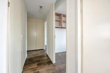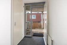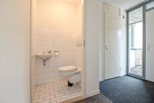 Gemeenschappelijke hoofdentree met bellen- en brievenbussentableau, liftinstallatie of trappenhuis naar de woonlaag, gaanderij naar de woning, voordeur woning.