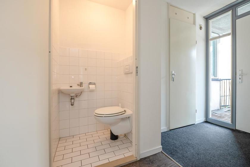 L-vormige hal met de meterkast, de wc-ruimte met fontein en een bergruimte met de opstelplaats voor de was- en droogmachine, de cv-ketel en de unit WTW.