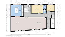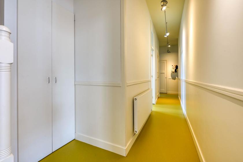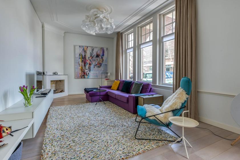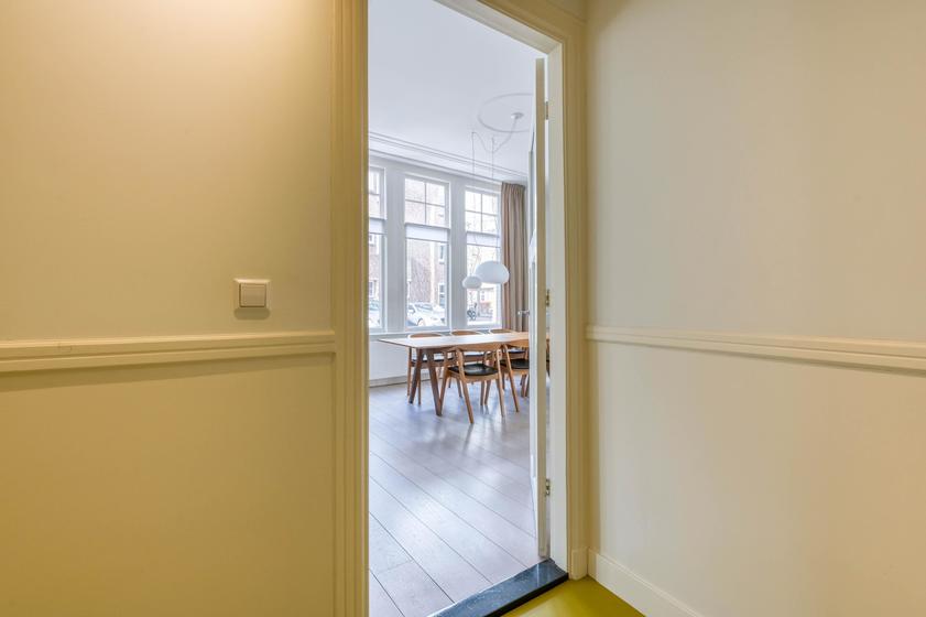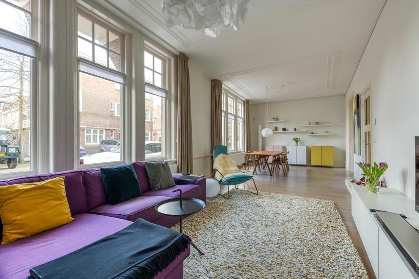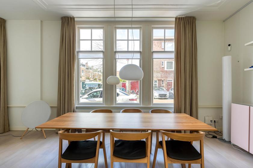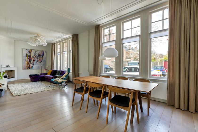 De zit-/eetkamer ligt aan straatzijde, over de breedte (circa 10.85m) van het huis. Het is een bijzondere ruimte met zes raampartijen, een plafondhoogte van circa 3.15m en een fraaie houten vloerdecoratie.