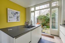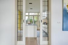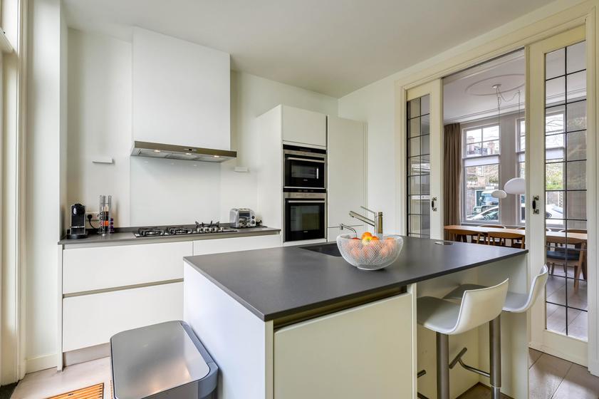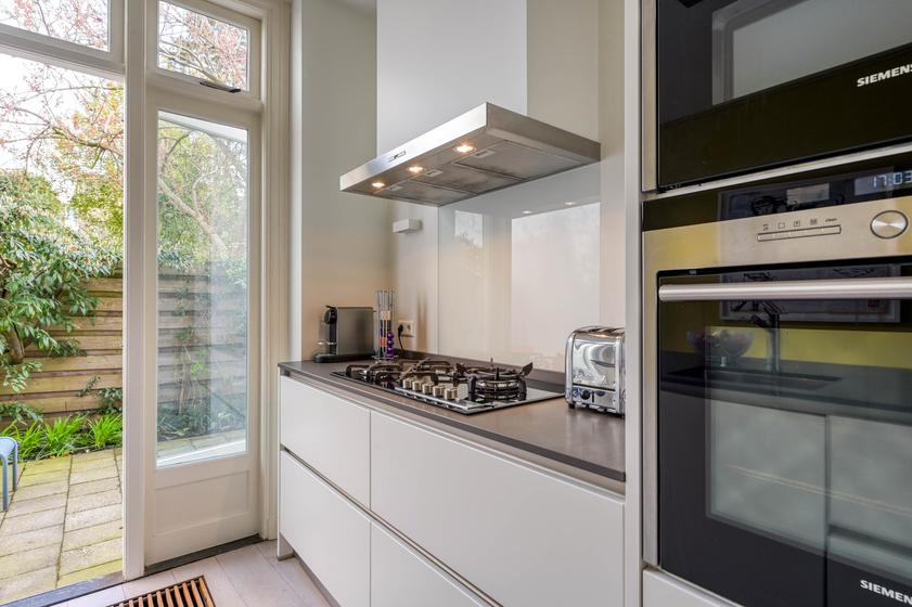 De eetkeuken heeft schuifdeuren naar de woonkamer en openslaande deuren naar de tuin. De keukenunit met barfunctie en de keukenwand hebben een praktische indeling met veel kastruimtes en (bestek-)lades en zijn geoutilleerd met (inbouw-)apparatuur: Siemens oven, Siemens magnetron, Boretti-pits kookplaat, ventilatiekap, koel-/vrieskast, vaatwasser en Quooker.