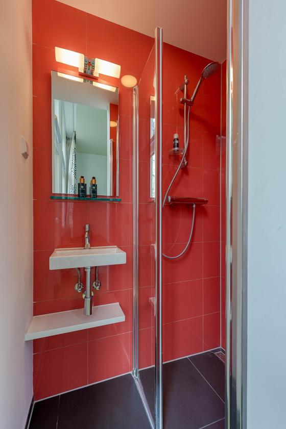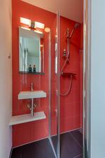 De (gasten-)slaapkamer annex badkamer heeft een deur naar de tuin. De gastenbadkamer is voorzien van een wastafel en douche.
