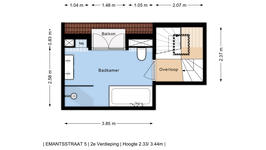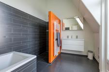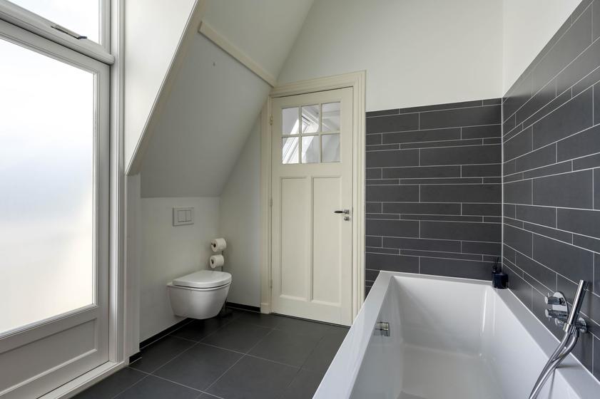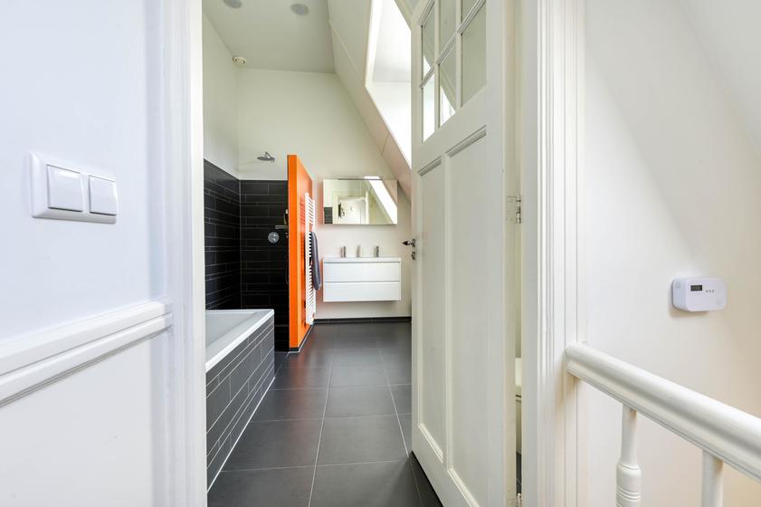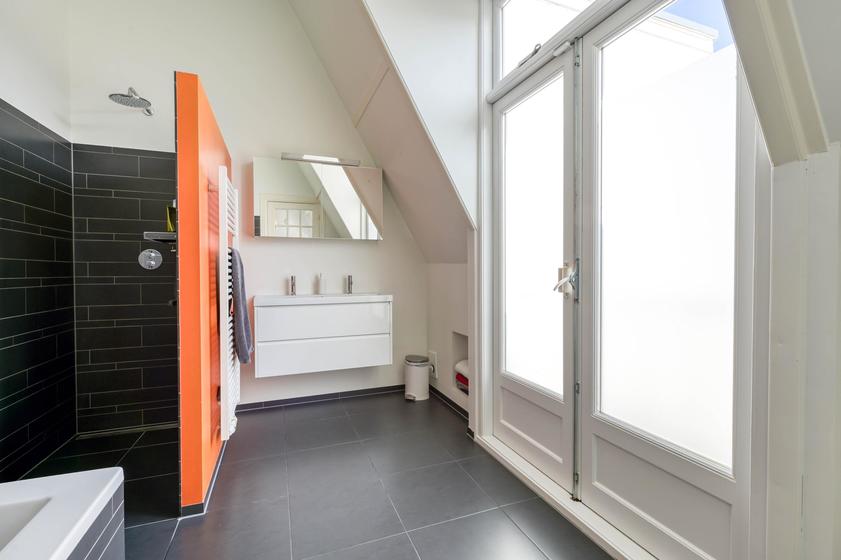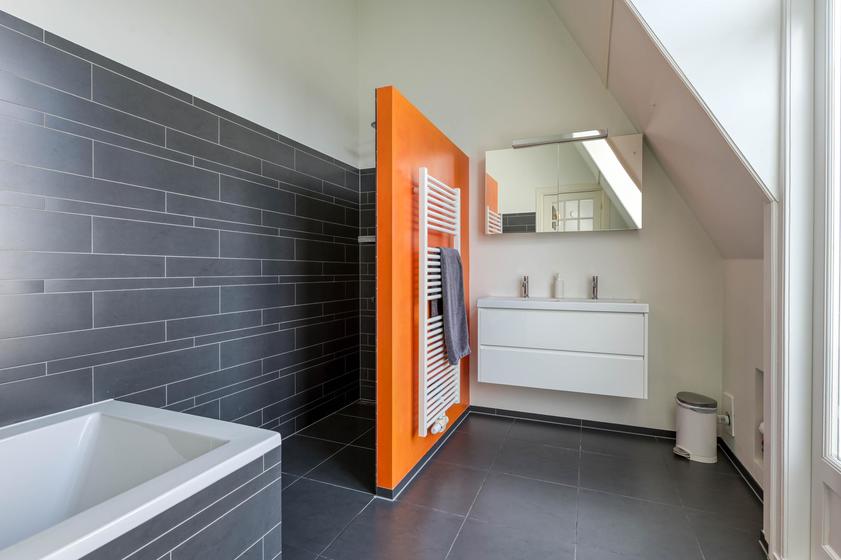 INDELING TWEEDE VERDIEPING Overloop met dakraam. Een eigentijds en praktisch ingerichte badkamer met een inloopdouche, wc, ligbad en een meubel met wastafel.