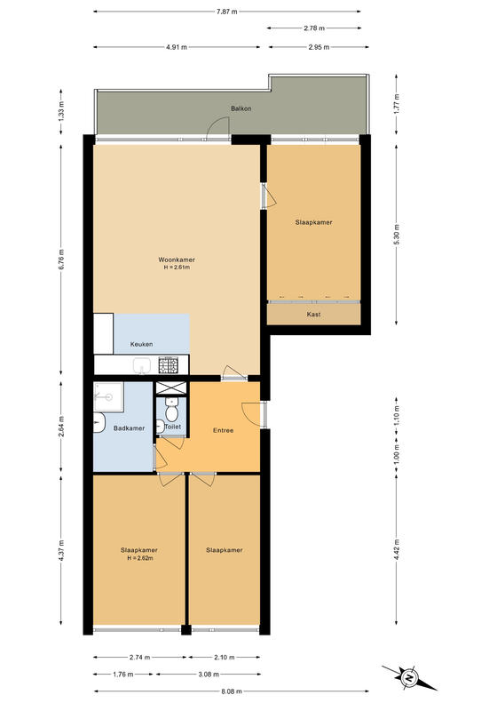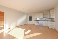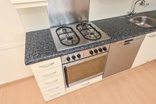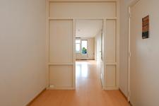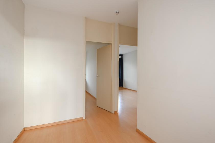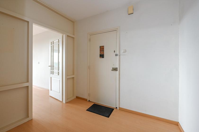 Hal met de wc-ruimte voorzien van een fontein. De woonkamer met open keuken heeft een deur naar het balkon en de voorzijkamer/slaapkamer met vaste kast. Het woning-brede balkon is ruim, ligt op het zuidwesten en vangt de middag- en avondzon.