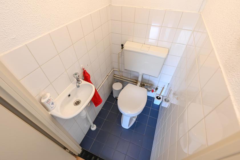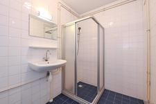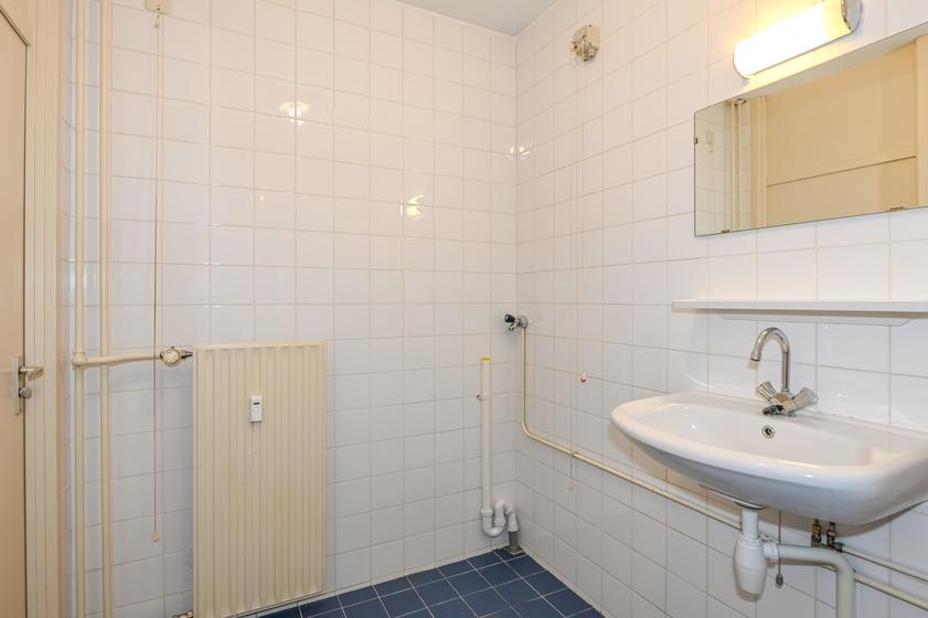 De tussenliggende badkamer is ingericht met douche, wastafel en de opstelplaats voor een wasmachine.