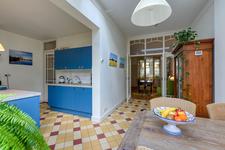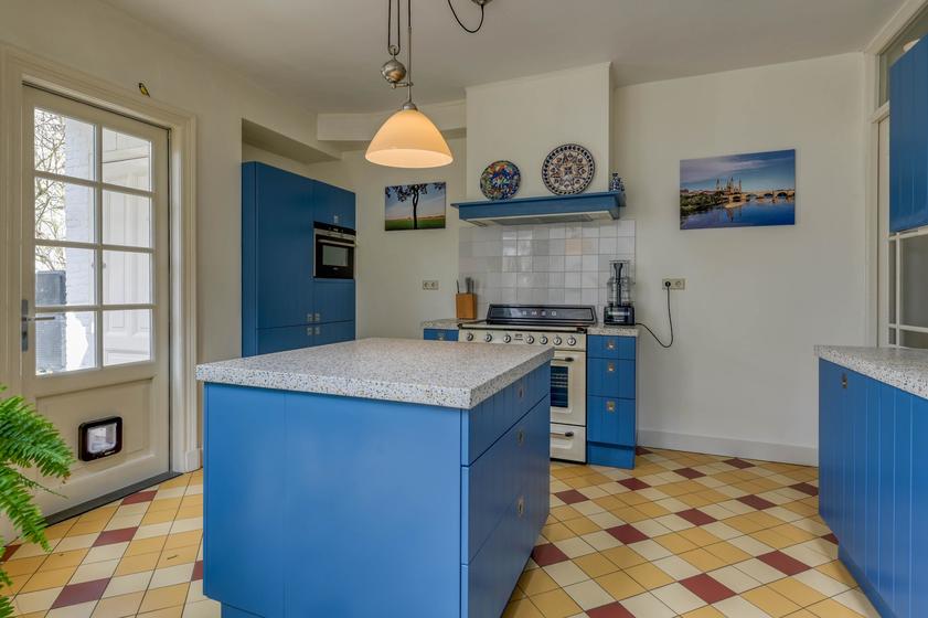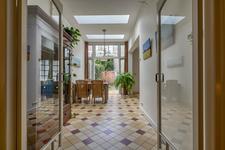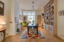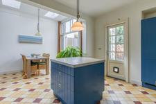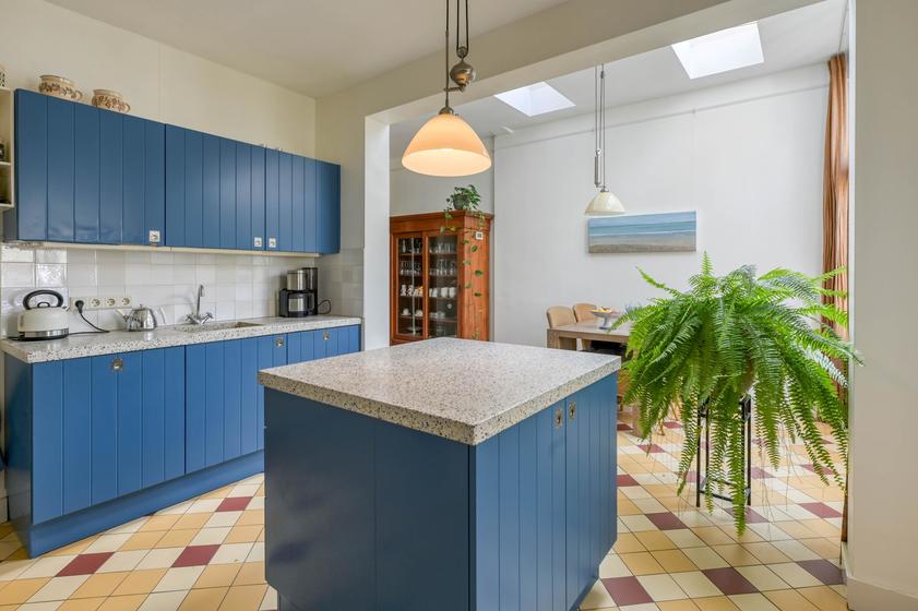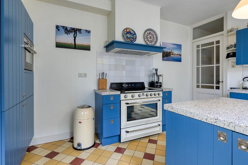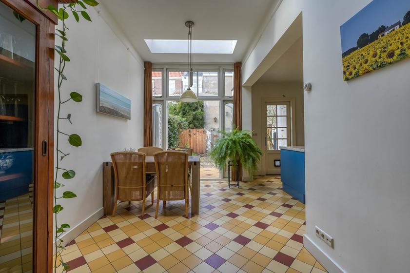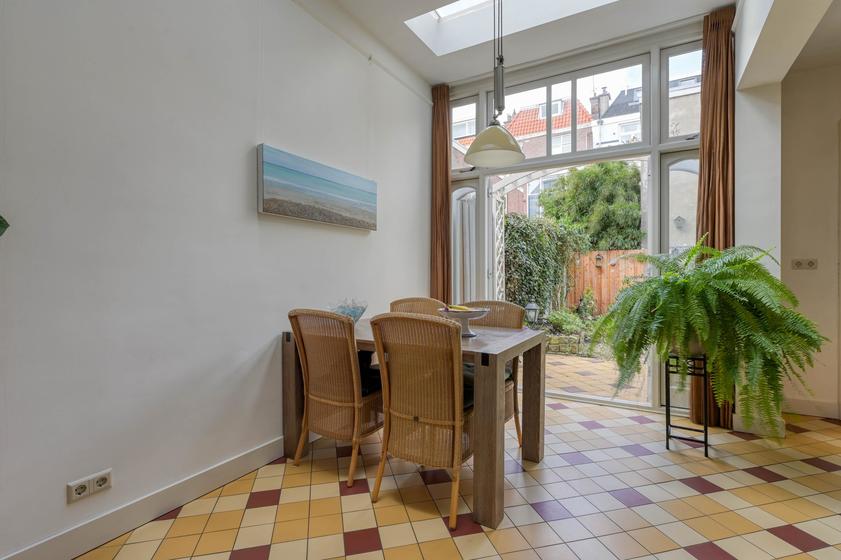 Drie vertrekken en suite: de lichte zitkamer (met zicht op de fraaie huizen aan de overzijde), de eetkamer en de uitbouw/serre. De uitgebouwde serre heeft twee glasdaklichten en openslaande deuren naar de tuin. De keukenruimte is in open verbinding met de serre en is praktisch en smaakvol ingericht met een keukeneiland met (laden)kasten, een kastenwand met de koel-/vrieskast, de kookunit met afzuigkap, alsmede een wandopstelling met een aanrecht, gootsteen en inbouwvaatwasser.