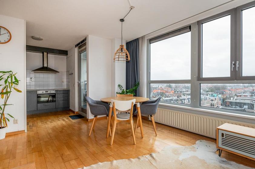 Voordeur, gang met wc-ruimte met wandcloset en - fontein, vaste kast met opstelplaats wasmachine, -droger, unit mechanische ventilatie en de cv-ketel. Buitengewoon lichte zit-/eetkamer met een fenomenaal uitzicht over zuidoost en zuidwest Den Haag. De keukenruimte is in open verbinding met de woonkamer en heeft een L-vormige opstelling met een (inbouw-) Siemens vaatwasser, Siemens kookplaat en Samsung koel-/vrieskast.