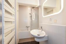 Tussenliggende, sober ingerichte badkamer met een douche, handdoekradiator en een wastafel.
