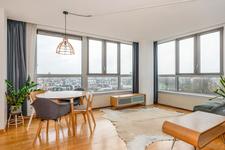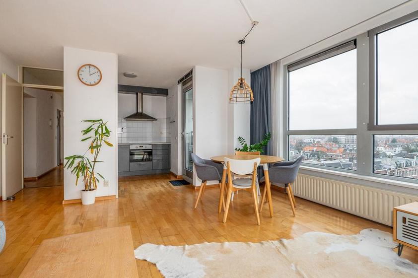 Dit super lichte appartement biedt een prachtig panorama! Geniet van de skyline van onze residentie. Op de zesde verdieping van het appartementencomplex Residence Eline Vere (1998) bieden wij aan een nette, eenvoudig ingericht driekamer-hoekwoning (circa 71 m2) met een inpandig balkon (circa 5 m2) op het zuidoosten, een berging en een PARKEERPLAATS in de onderbouw.