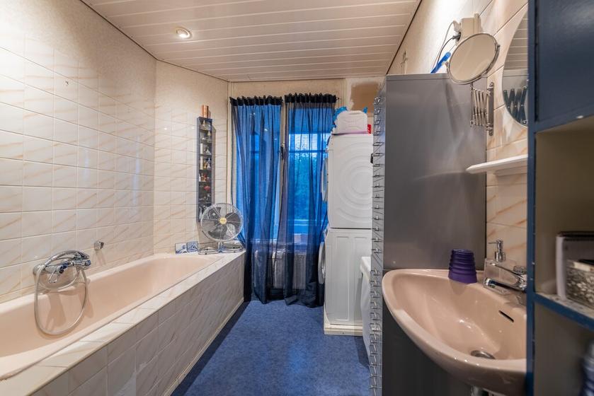 BADKAMER Royale badkamer met ligbad, wastafel en de opstelplaats voor de wasmachine en -droger.