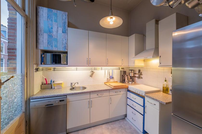 Aan straatzijde de WOONKAMER (circa 7.40x4.00) en de KEUKENRUIMTE. De eenvoudige L-vormige keukenopstelling is voorzien van (inbouw-)apparatuur. Mede door twee (schuif-)ramen en de karakteristieke deurpartij met Frans balkon worden deze vertrekken gekenmerkt door een mooie lichtinval.