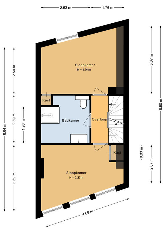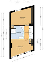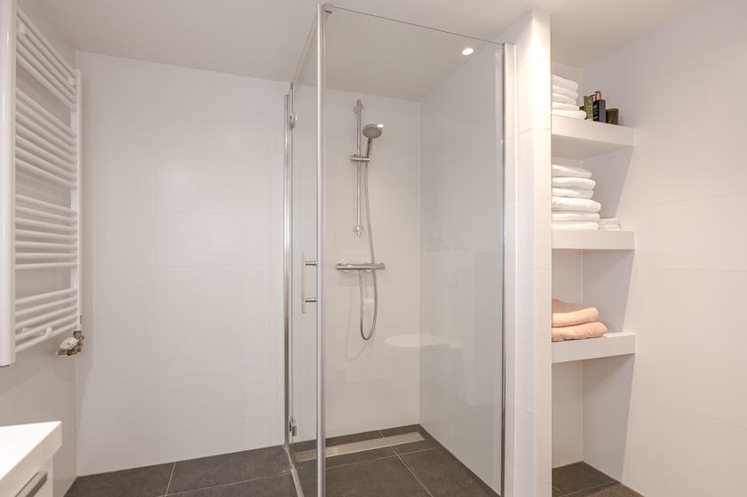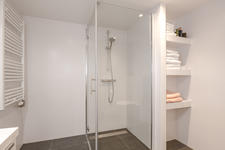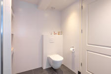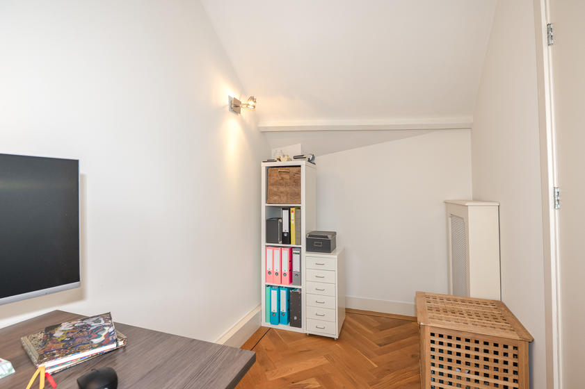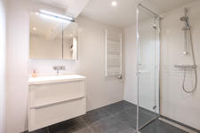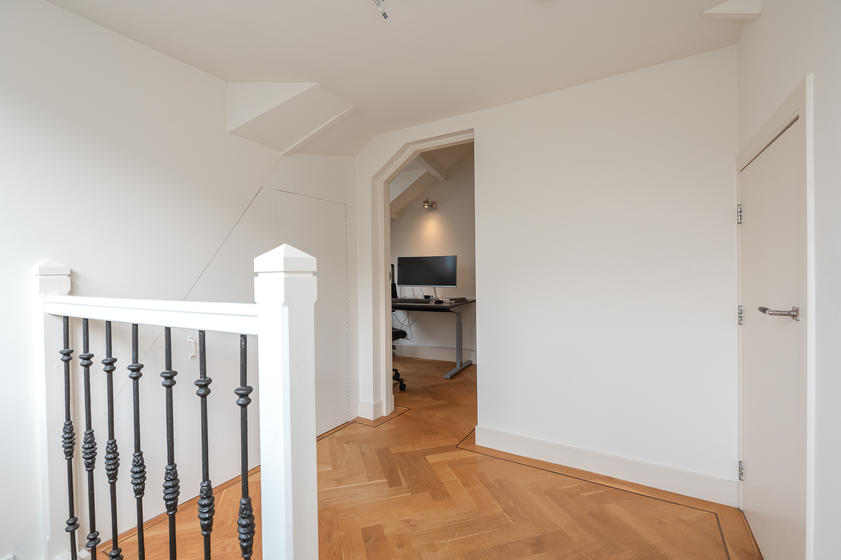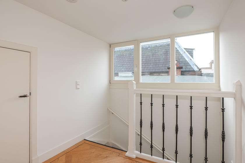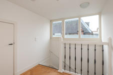 TWEEDE VERDIEPING Overloop. Aan straatzijde ligt slaapkamer 1 met drie ramen en een praktische vaste kast. Aan de achterzijde ligt slaapkamer 2 met een dakraam en een vaste kast. De tussenliggende badkamer is neutraal betegeld en modern ingericht met een douche, wc, designradiator, een meubel met wastafel en een spiegelkastje.