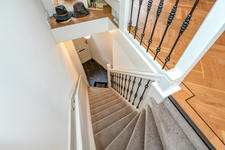 VLOERDECORATIE De woon- en slaapverdiepingen hebben, behalve de badkamer, een mooie visgraatparketvloer met bies.