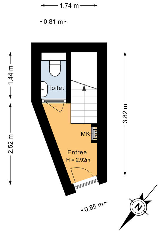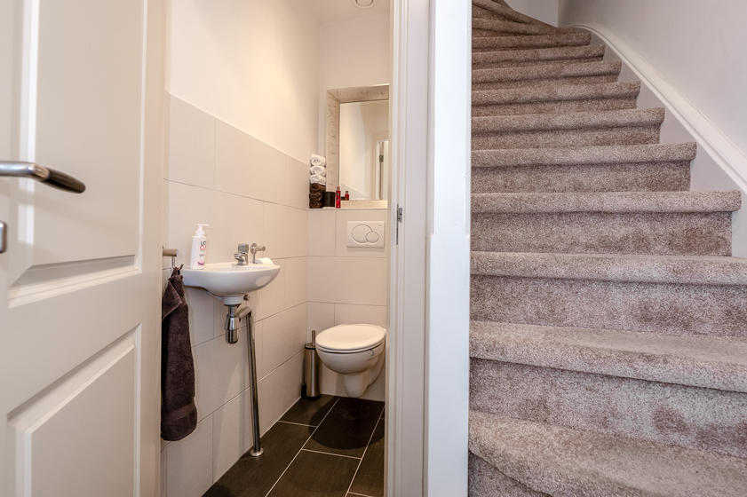 BEGANE GROND: voordeur, ruime entreehal met een betegelde vloer, de meterkast en de wc-ruimte met fontein. Een fiets kan er staan.
