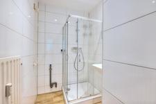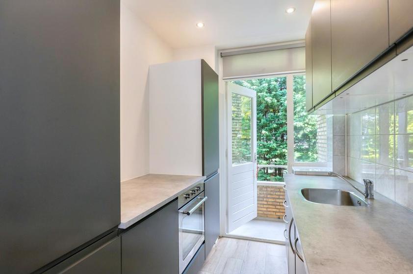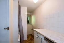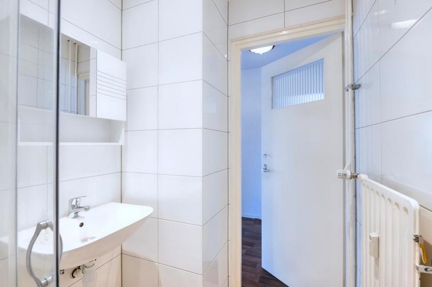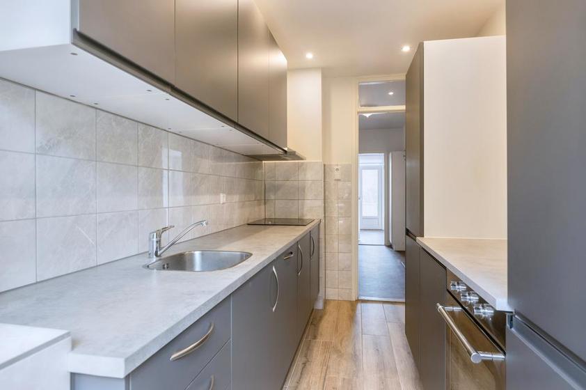 Aan de achterzijde de keukenruimte met een deur naar het balkon, ingericht met een moderne keukenopstelling met inbouwapparatuur zoals inductie kookplaat, vaatwasser, koelkast en elektrische oven en de opstelplaats boiler. Tussenliggende badkamer met douche en vaste wastafel.