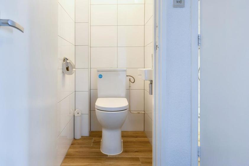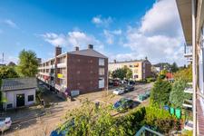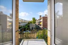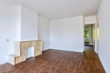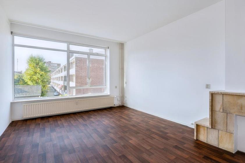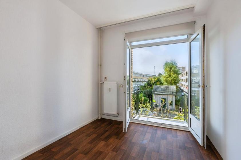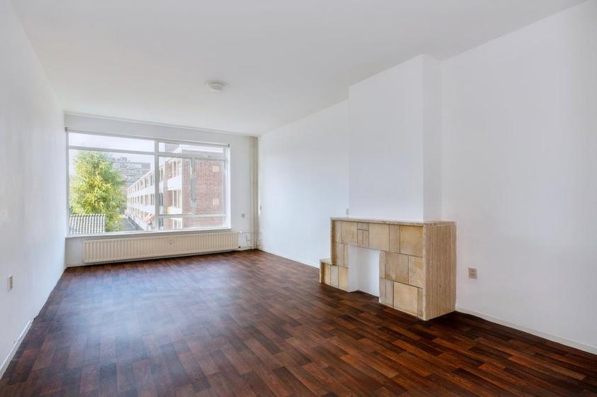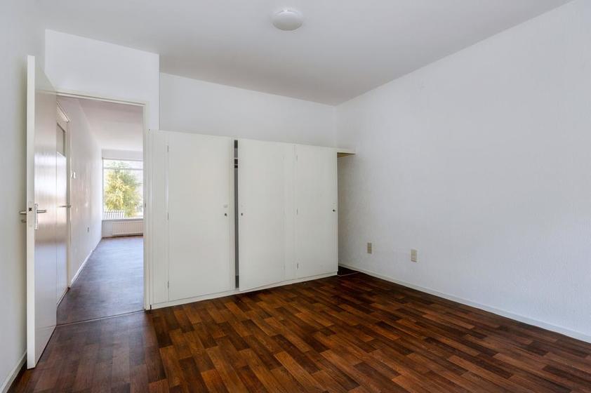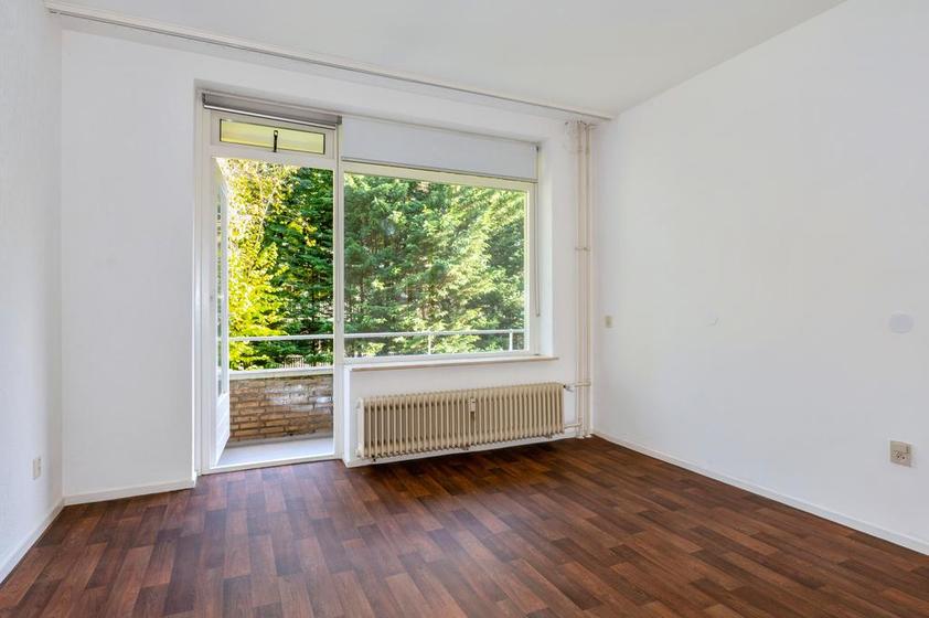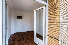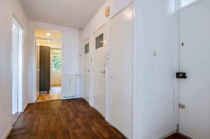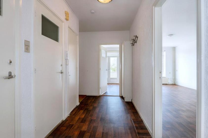 Ruime hal/entree met de meterkast en de wc-ruimte met fontein. Grote, lichte woon-eetkamer met vinyl vloer en ruim uitzicht. Aan de achterzijde: een goed formaat slaapkamer met een vaste kastenwand en toegang tot het balkon. Voorzijkamer met openslaande deuren naar een balkon.