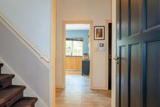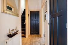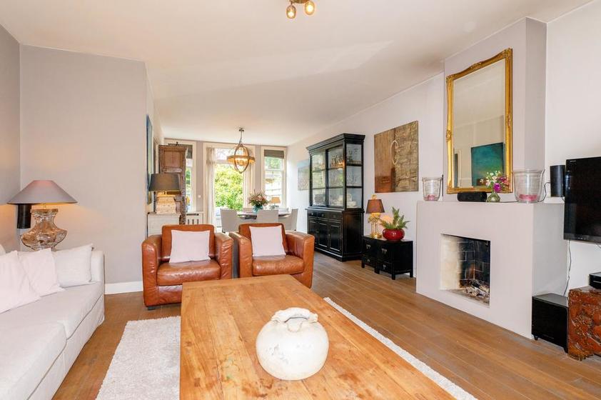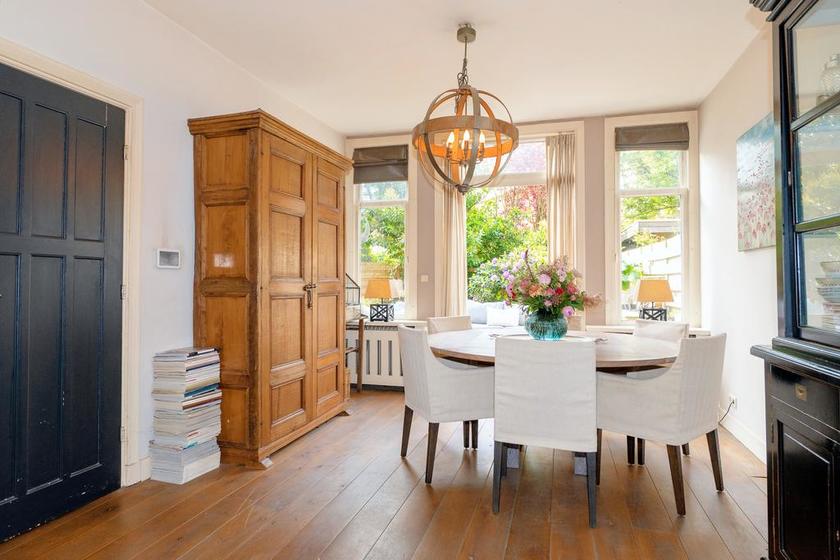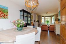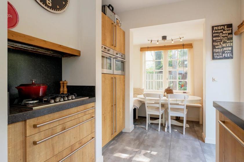 Doorgebroken woon-/eetkamer met eikenhouten parketvloer, gas haard en openslaande deuren naar zowel de voor- als achtertuin. Ruime eetkeuken met L-vormige opstelling met inbouwapparatuur en gezellige hoekbank. Deur naar de achtertuin.