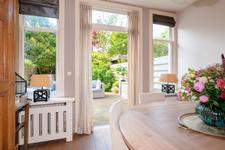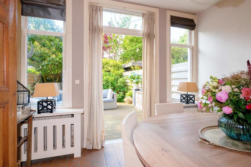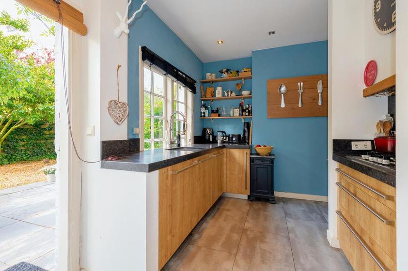 Twee grote raampartijen in de keukenruimte bieden zicht op de tuin.