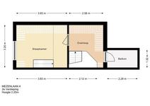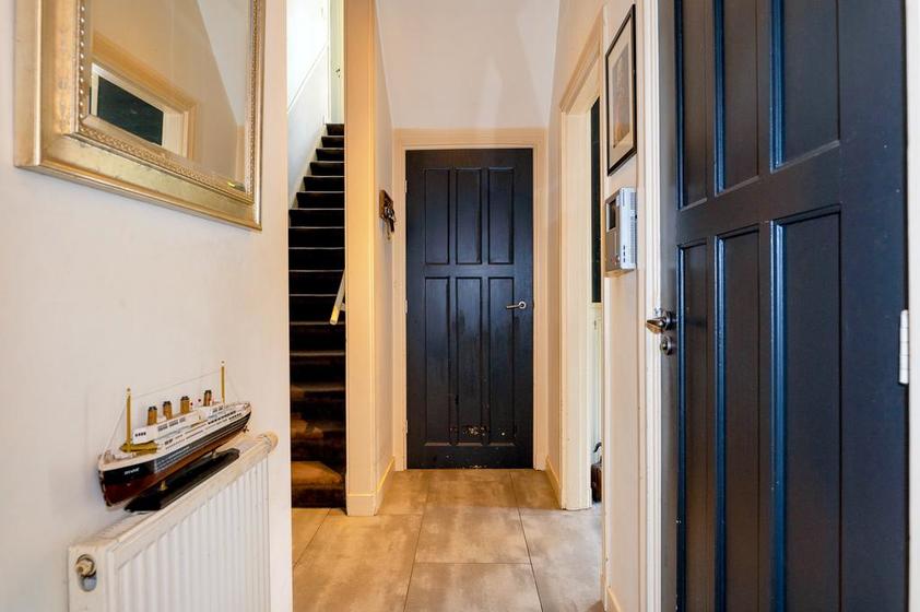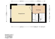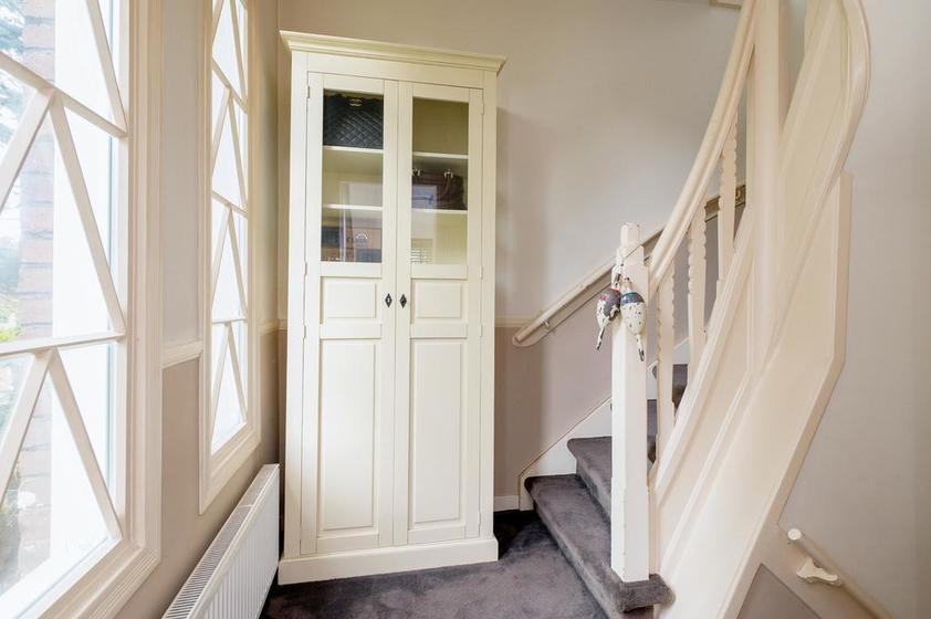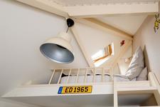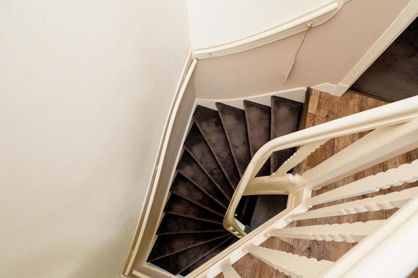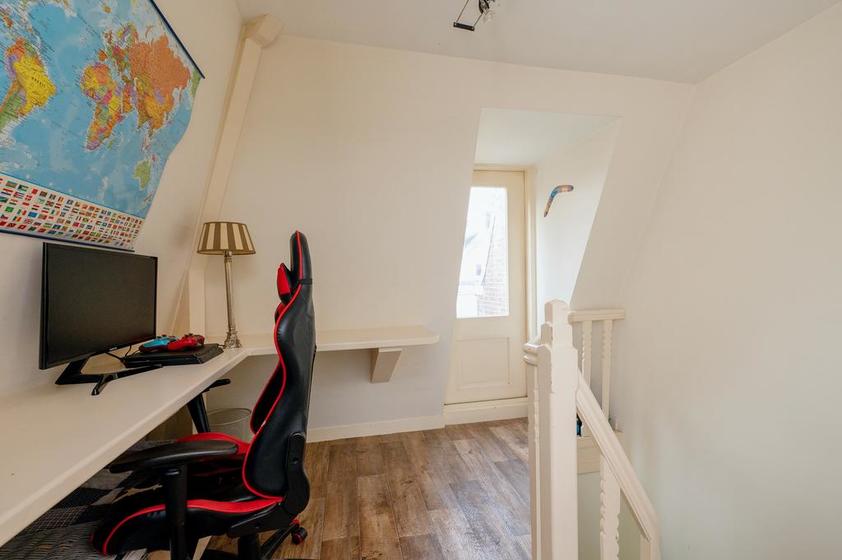 Trap naar TWEEDE VERDIEPING. Overloop/werkruimte. Aan de voorzijde: slaapkamer 3. Het balkon aan de achterzijde is bereikbaar vanaf de overloop.