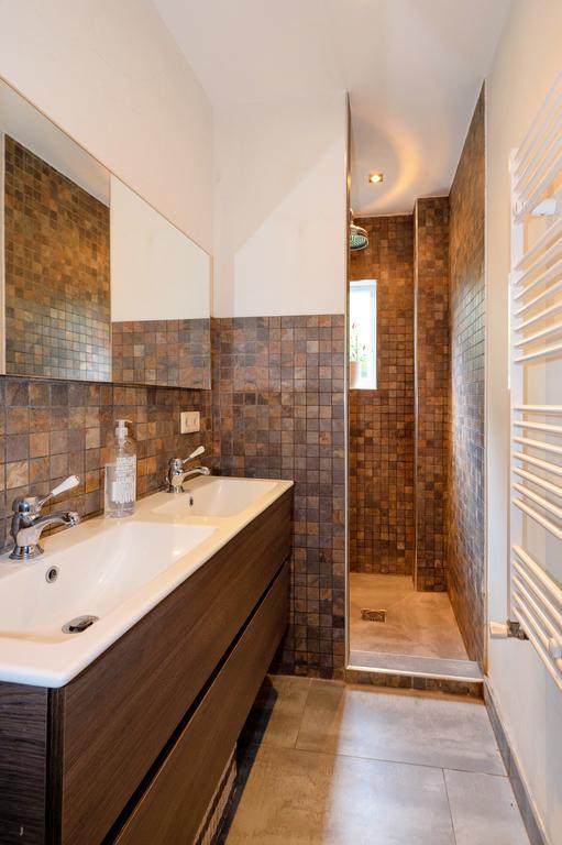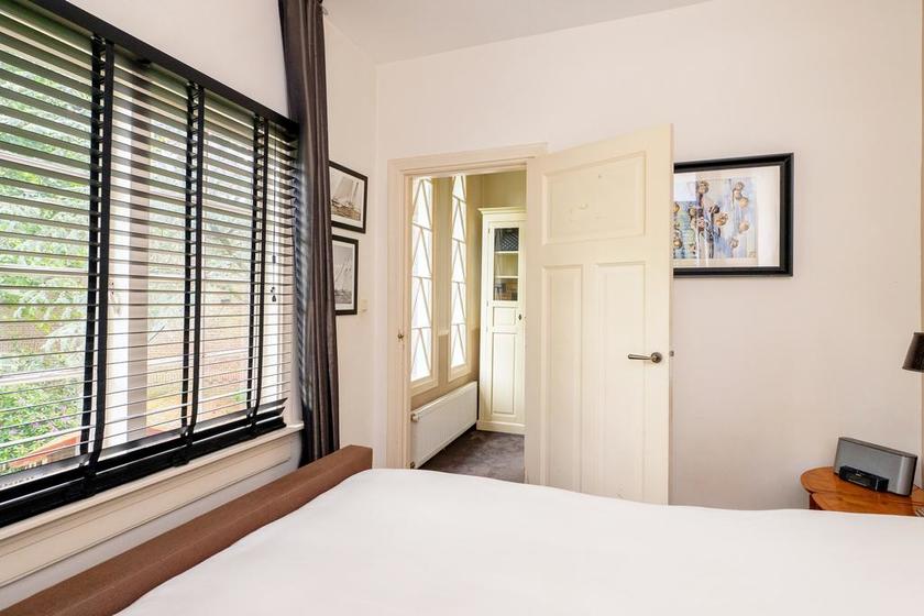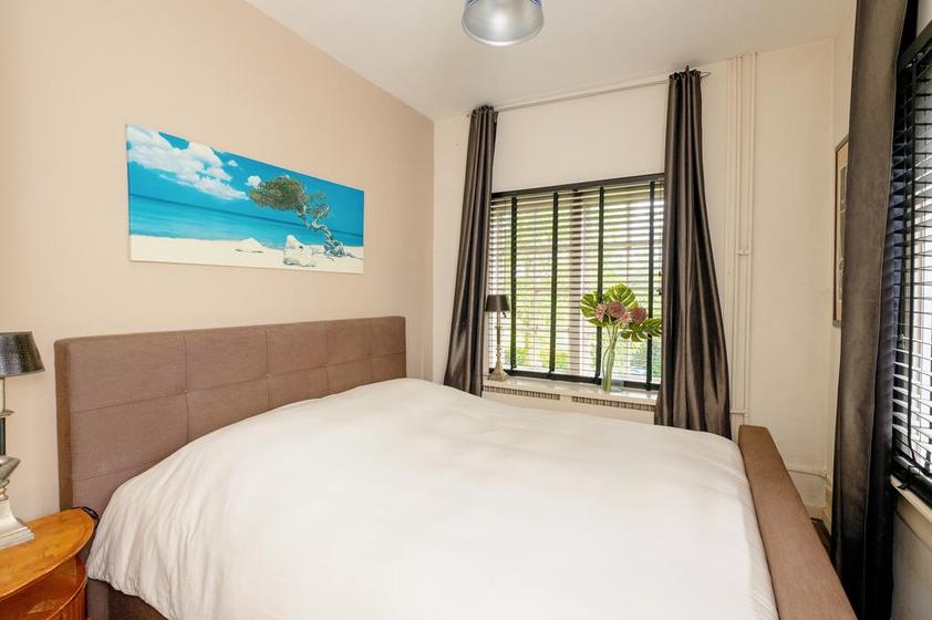 Aan de voorzijde een grote slaapkamer met twee grote ramen en eikenhouten parketvloer. Aan de achterzijde een modern ingerichte badkamer voorzien van vloerverwarming, een meubel met dubbele wastafel, een regen- en handdouche en een designradiator.