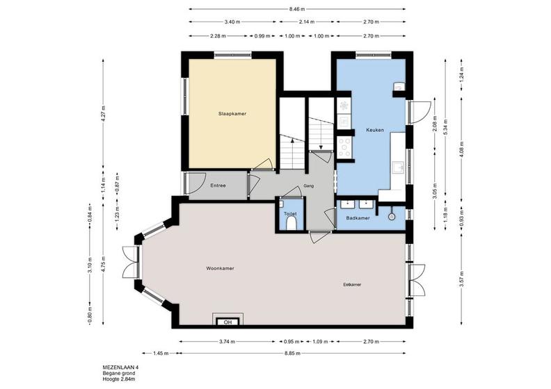 BEGANE GROND Voortuin, voordeur, vestibule en hal met toegang tot de wc, badkamer, kelder, keuken en woon-/eetkamer.