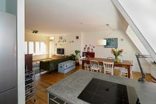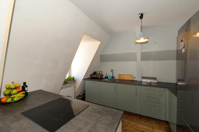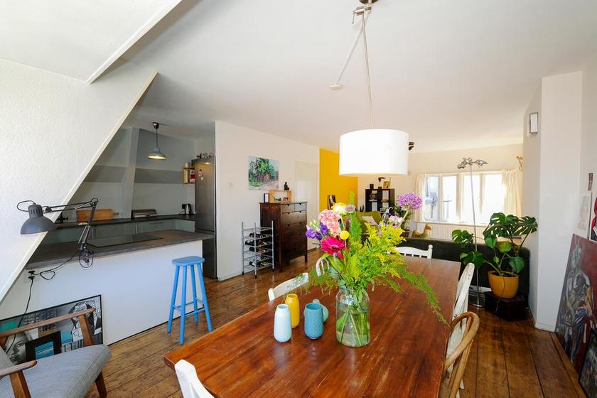 Sfeervolle zit-/eetkamer in open verbinding met de keukenruimte. De dakkapel biedt zicht op het bijzondere dak-landschap van panden aan de Molenstraat, Noordeinde en Prinsestraat. De eigentijdse keukenopstelling (2020) heeft een kookeiland en eetbar.