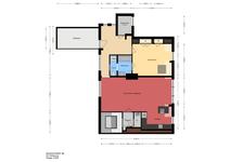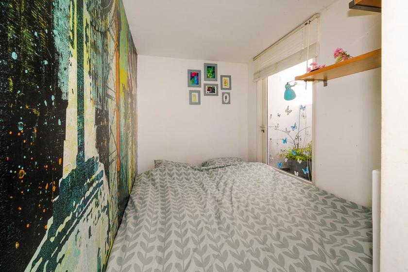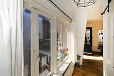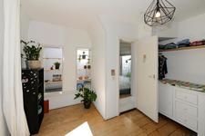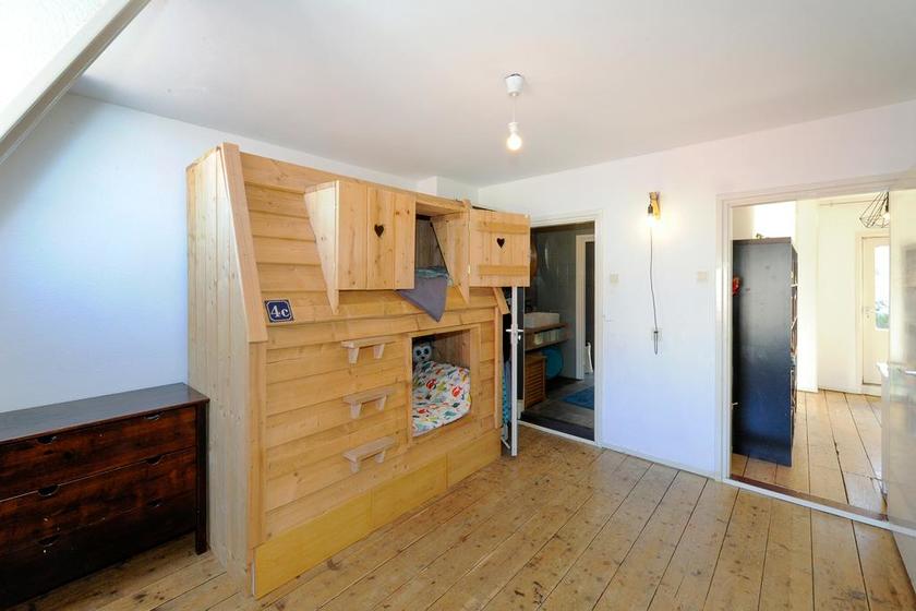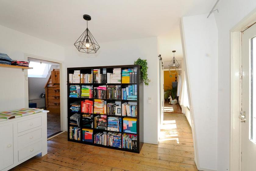 Ruime hal met toegang tot de wc annex badkamer, een bergruimte/bedstee (nu ouderslaapkamer) en het terras. De hal zou kunnen worden gebruikt als tweede slaapkamer, dan wel hobby-/studeerkamer.