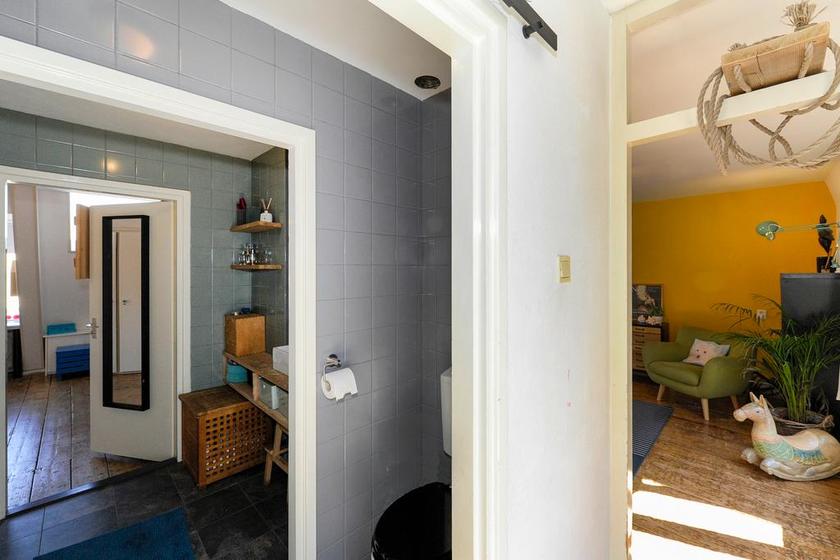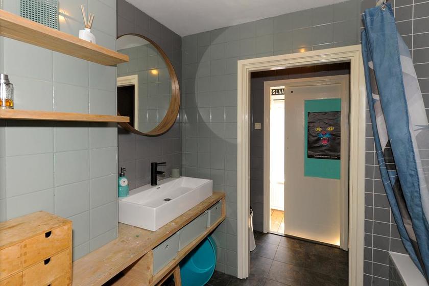 De badkamer heeft een ligbad en wastafel en is in open verbinding met de wc-ruimte voorzien van de wasmachineaansluiting.