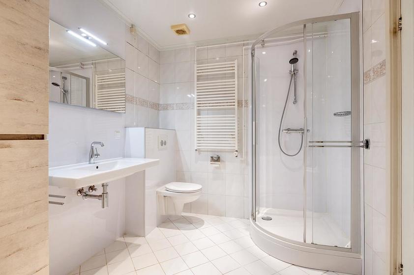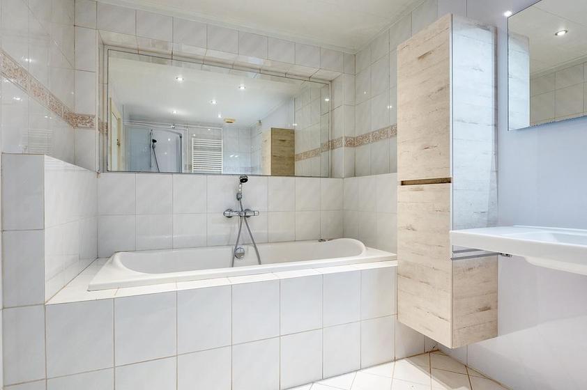 UITBOUW BEGANE GROND: Gang. Modern uitgevoerde badkamer met een ligbad, wandkast, douchecabine, wandcloset, wastafel en designradiator. Vervolgens twee achter elkaar liggende slaapkamers.