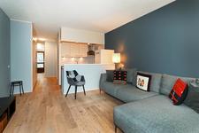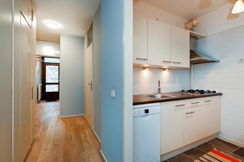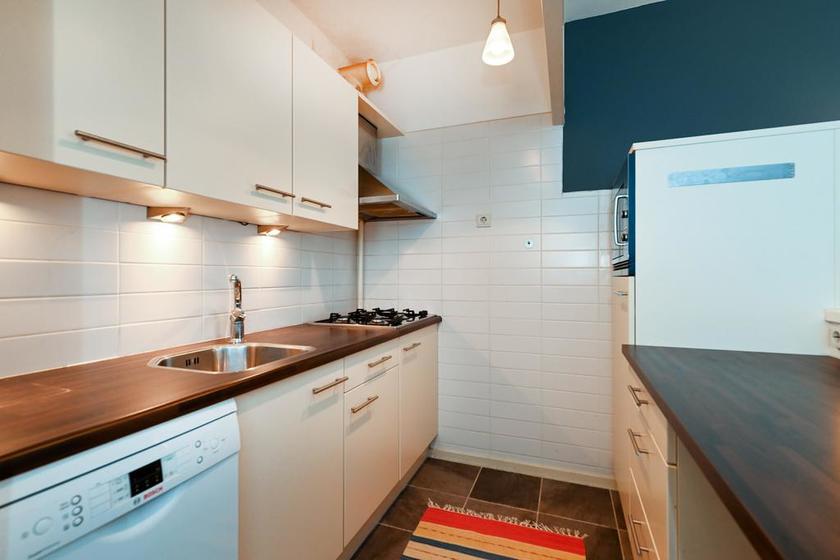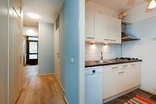 Vestibule, vestibuledeur, gang met garderobe-/meterkast. Aantrekkelijke ZIT/EETKAMER met OPEN KEUKEN en een deur naar het balkon. De eenvoudige keukenopstelling heeft boven- en onderkasten met fornuis, ventilatiekap, ijskast en vaatwasser.