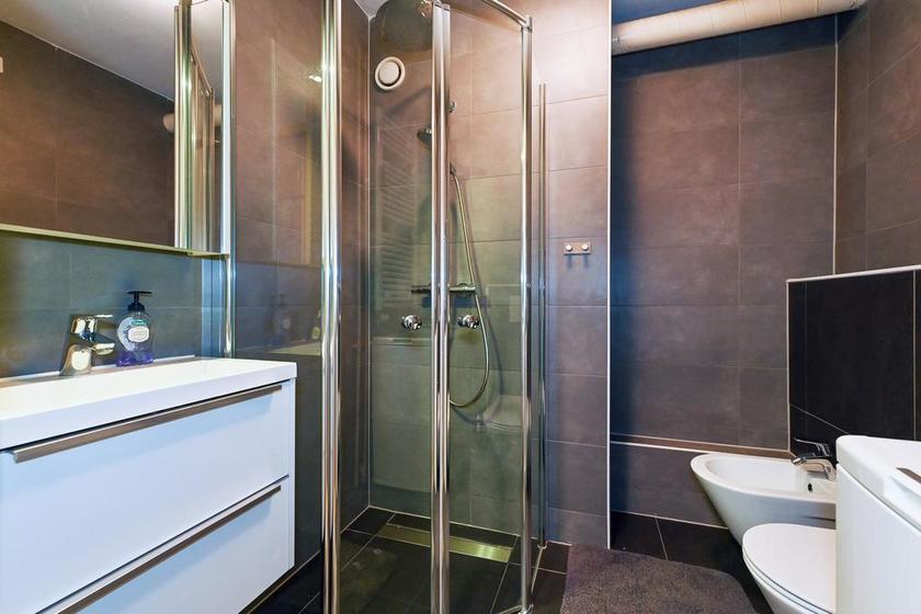 Tussenliggende eigentijds ingerichte BADKAMER met douchecabine, bidet, wc, designradiator, wastafelmeubel, spiegelkastje en de opstelplaats voor de wasmachine.