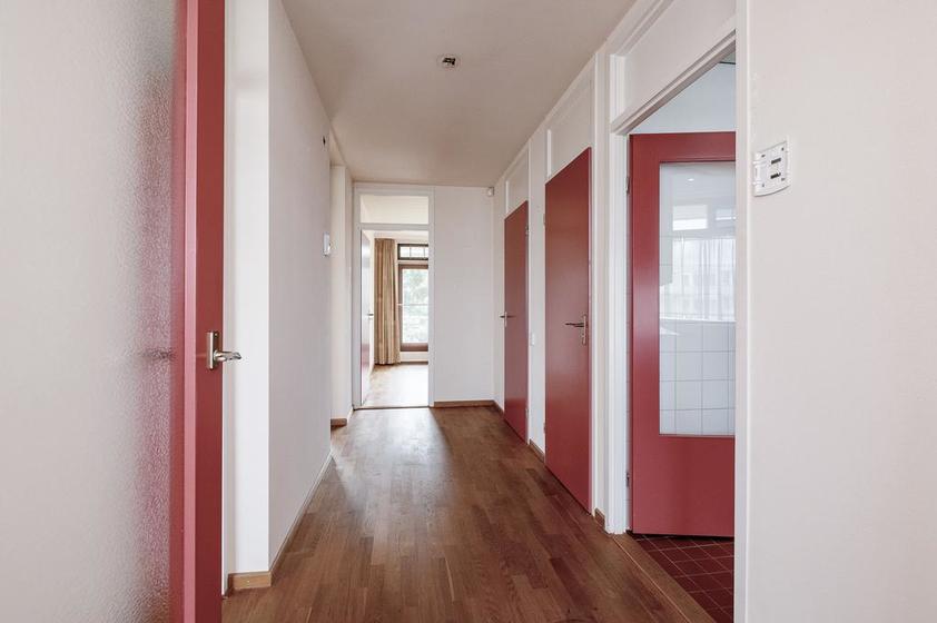 Entree gebouw: gemeenschappelijk entreehal, binnenhal, trappenhuis of lift naar de vijfde verdieping, gaanderij, voordeur flat.