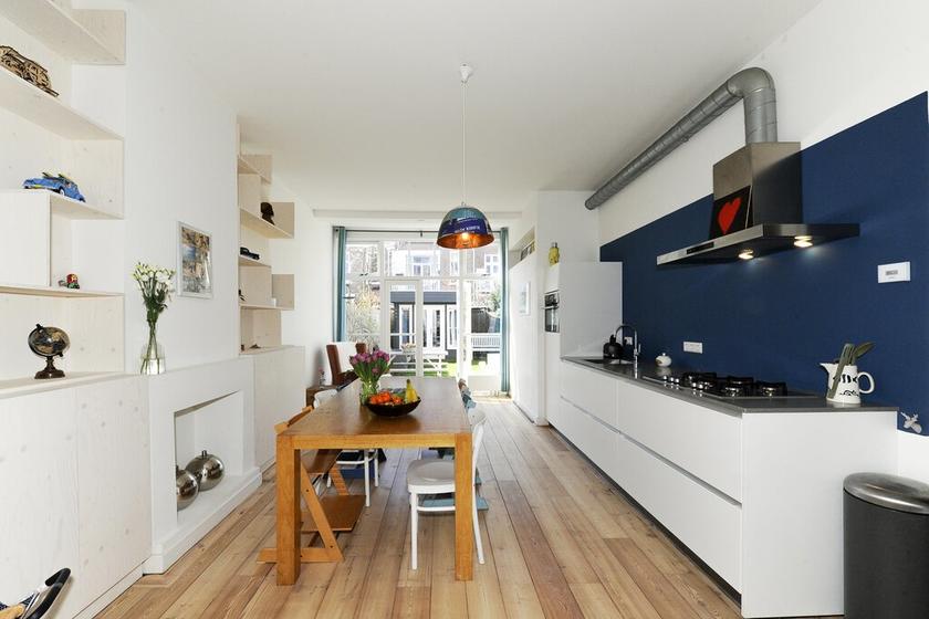 De woon-/eetkamer met open keuken is ruim van opzet, heeft nog een prachtige schuifdeurenseparatie en openslaande deuren naar de zonnige achtertuin (ZW). De open keuken/eetkamer is aan de achterzijde en vormt de centrale plek in dit huis. De zitkamer ligt aan de voorzijde en heeft zicht op de kade met groenvoorziening. Deze kamers hebben een vloer met houten delen.