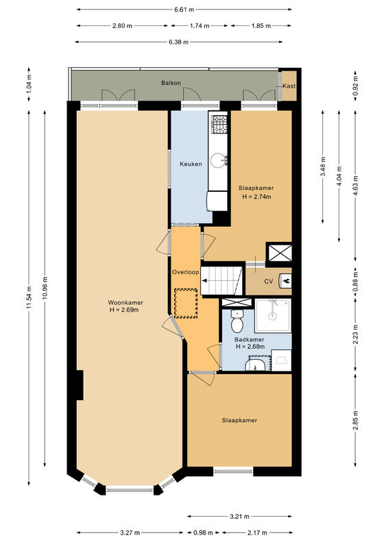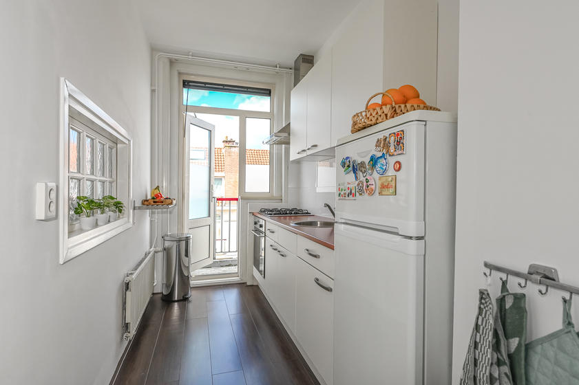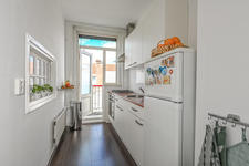De keukenruimte heeft een deur naar het balkon en is ingericht met een nette keukenopstelling met (inbouw)apparatuur. Twee slaapkamers: slaapkamer-1 aan de voorzijde, slaapkamer-2 aan de achterzijde met openslaande deuren naar het balkon.
