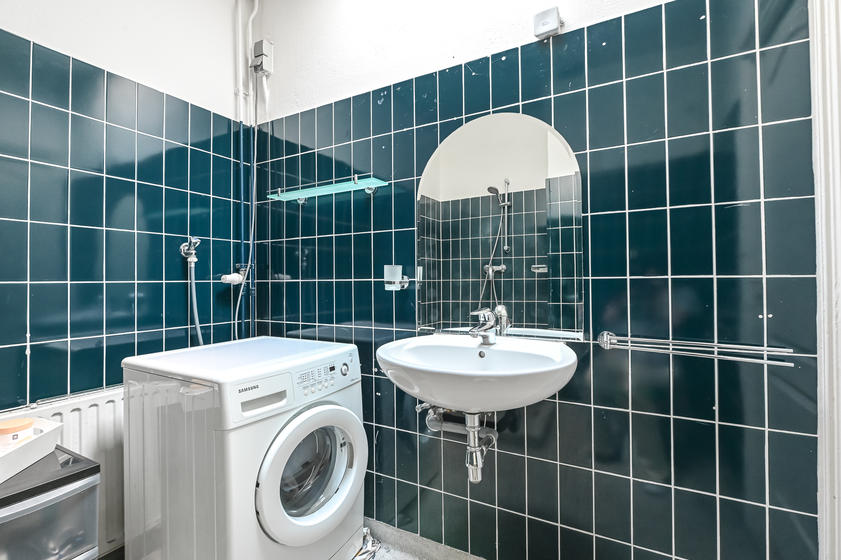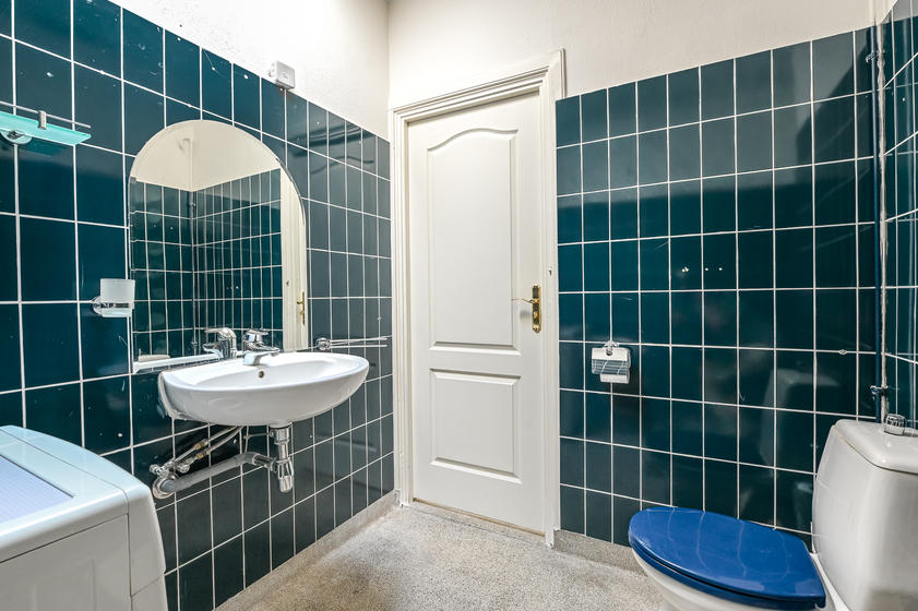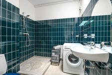 Eenvoudige ruime badkamer met toilet en douche. De badkamer is functioneel (met een wc, wastafel, douche en wasmachineaansluiting), maar enigszins gedateerd. Een mooie kans voor wie graag moderniseert naar eigen smaak.