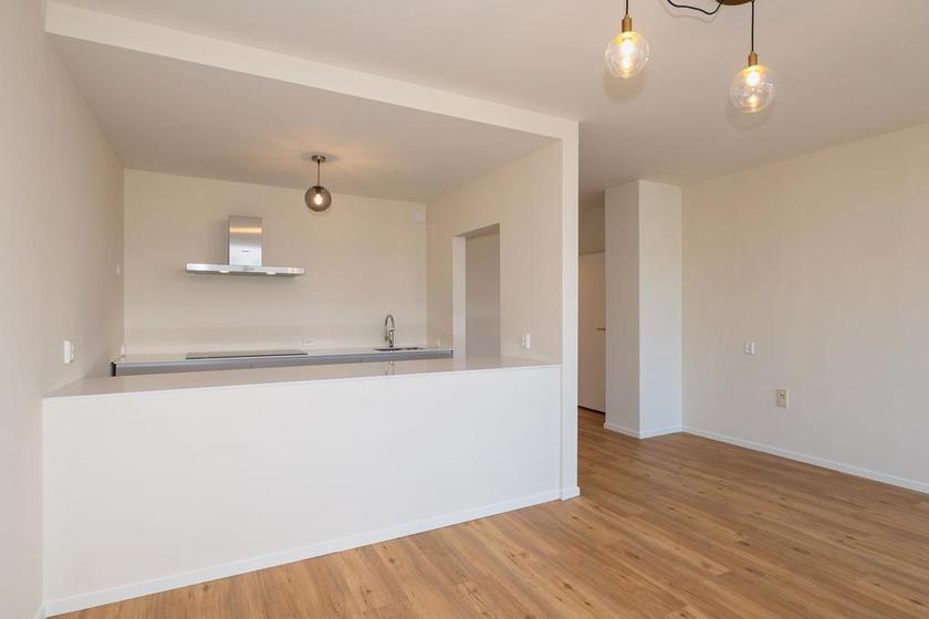 Sfeervolle en opvallend lichte ZIT-/EETKAMER met een OPEN KEUKEN en toegang tot het voorbalkon op het zuidwesten. De woonkamer en het balkon vangen volop de middagzon.