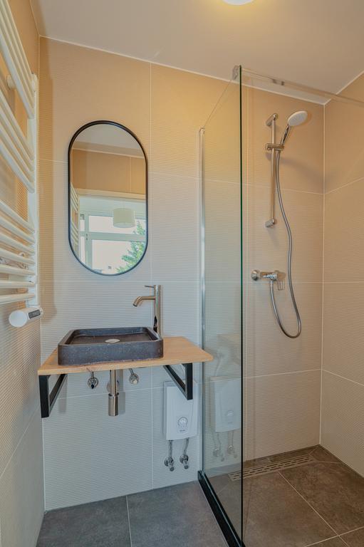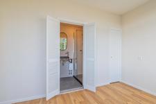 De aan de achterzijde van het complex liggende SLAAPKAMER (circa 385x248) heeft een diepe vaste kast en geeft toegang tot de eigentijds uitgevoerde DOUCHERUIMTE met designwastafel en handdoek-radiator.