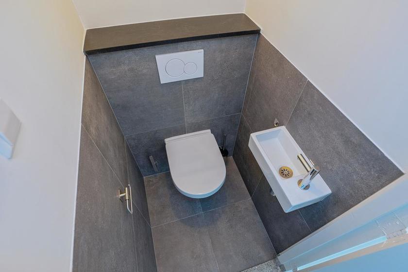INDELING FLAT Voordeur woning, tochtportaal, beknopte hal met een modern betegelde wc-ruimte met wandcloset en fontein en (meter)kast met de zeer uitgebreide elektrische installatie en doorloop naar de woonkamer.