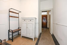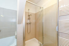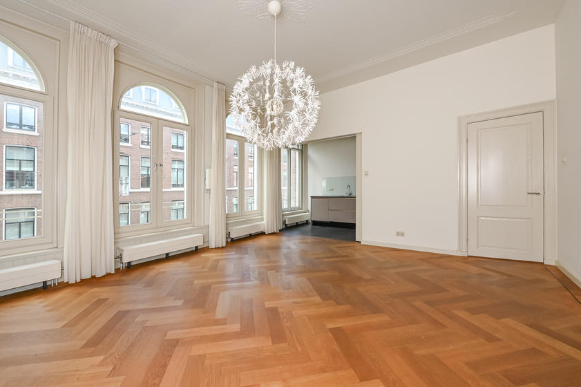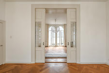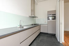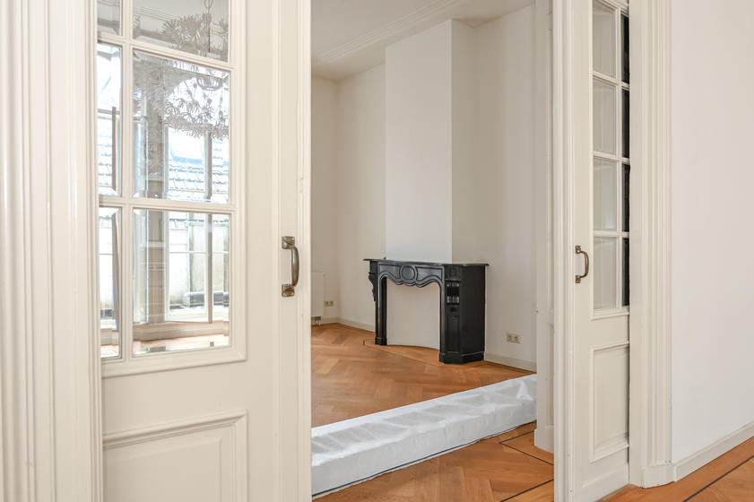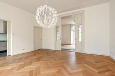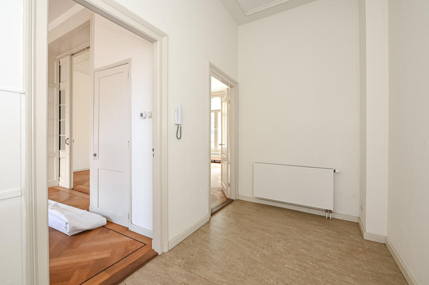At street side: A beautiful and very bright living/dining room (ceiling head: 3.37m) with three windows. This charming room lets in the afternoon sun. The semi-open kitchen has a practical L-shaped lay-out and incorporates fully fitted appliances and bespoke cabinetry. At the back the living room. Two pairs of French doors open unto to the balcony which catches the morning sun.