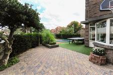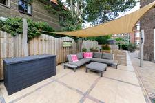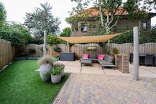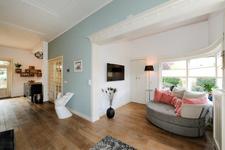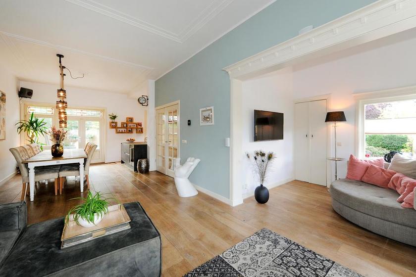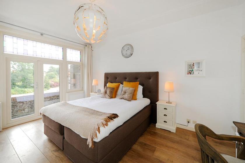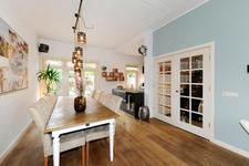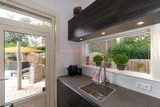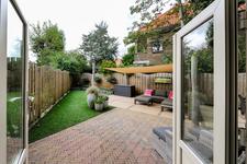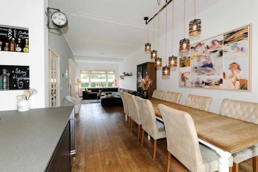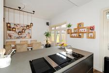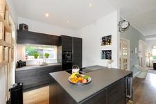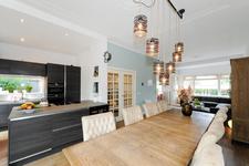Dubbele deuren naar de royale, lichte L-vormige woon-/eetkamer. In de achterkamer bieden openslaande deuren toegang tot de tuin. De keukenruimte is in semi-open verbinding met de eetkamer, heeft een deur naar de achtertuin en is ingericht met een eigentijdse opstelling met inbouwapparatuur (koel- en vrieskast, inductie-kookplaat met geďntegreerde afzuiginstallatie, oven, magnetron, vaatwasser en wijnkoelkast) en kook-schiereiland.