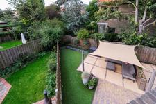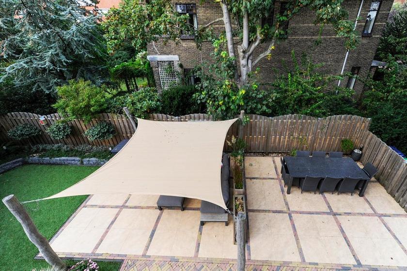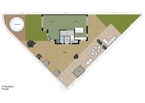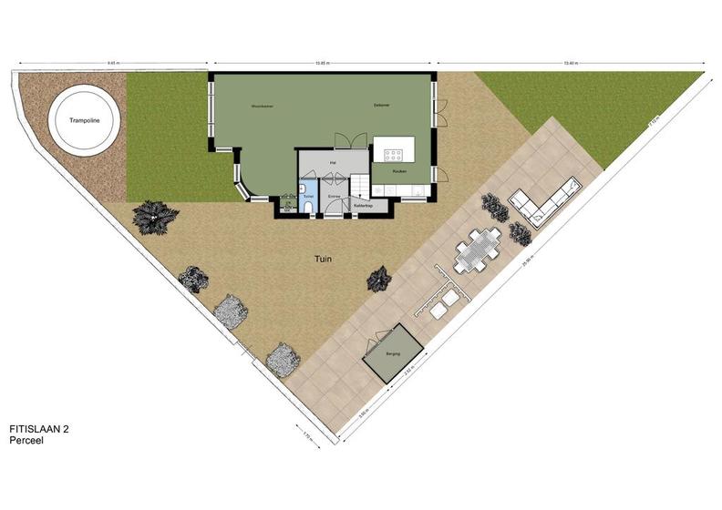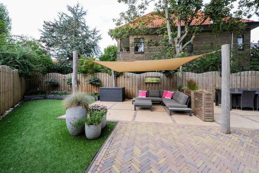 TUIN. Beter omschreven: tuinen. Een VOORTUIN met trampoline en speelruimte voor de kinderen, een ZIJ-TUIN met entree-pad, fietsenstalling, handige containeropslag en eethoek en een ACHTERTUIN met loungeplek, al dan niet onder een tarp, en een onderhoudsvrije grasmat.