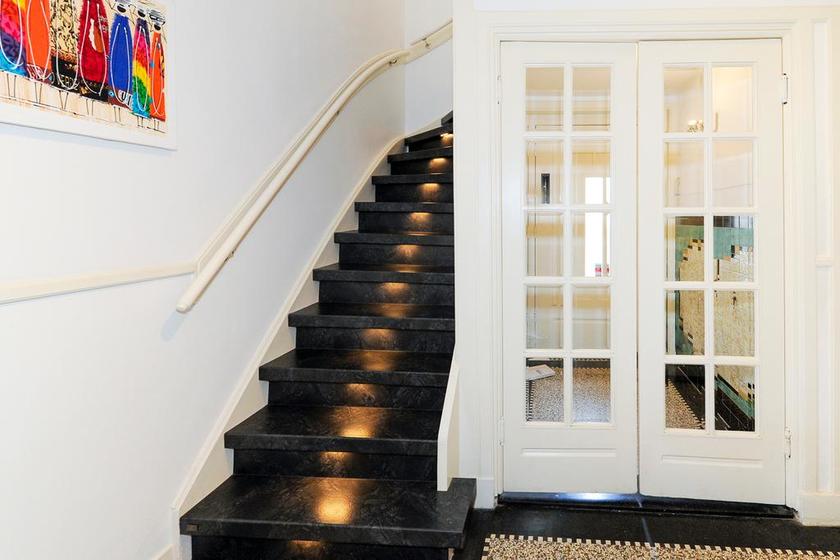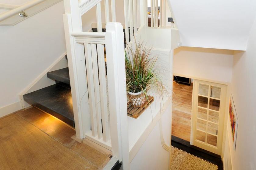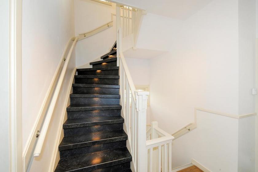 BEGANE GROND Entree via zij-tuin naar de voordeur. Vestibule met toegang tot de kelder en via tochtdeuren naar de hal met wc en de recent gerenoveerde bordestrap met tredeverlichting naar overloop op eerste etage.