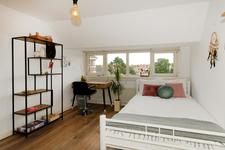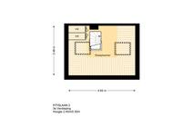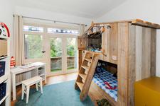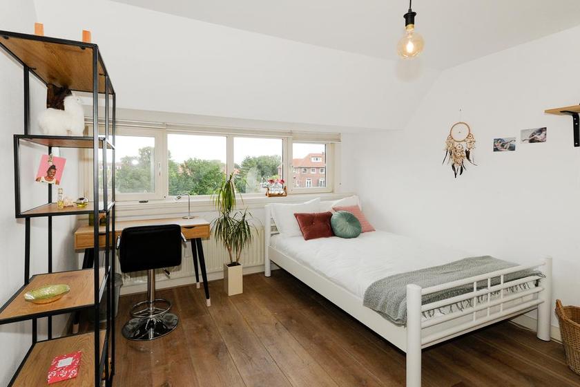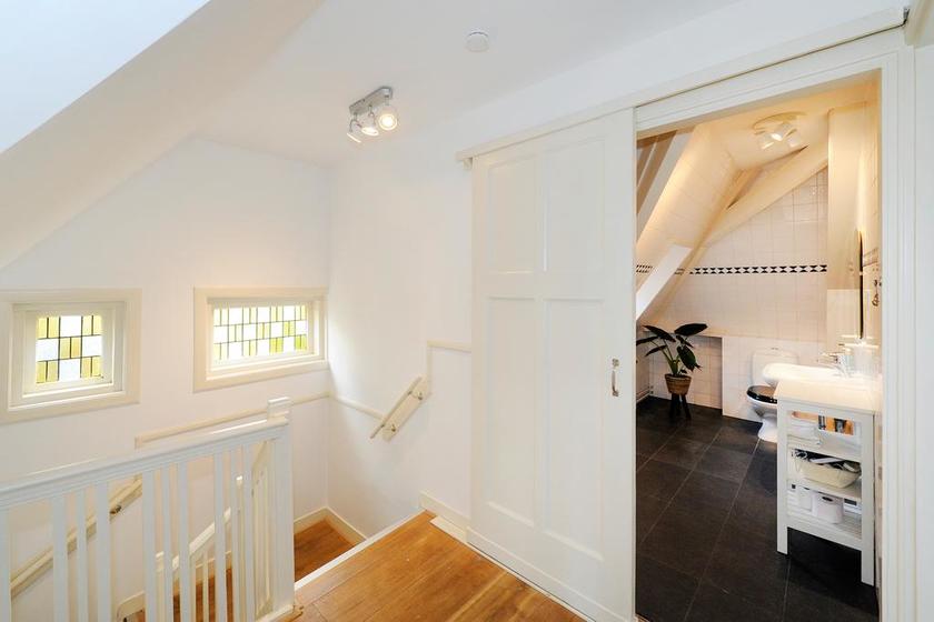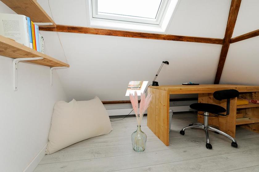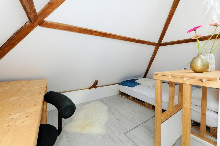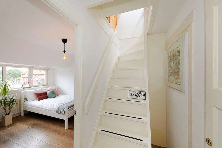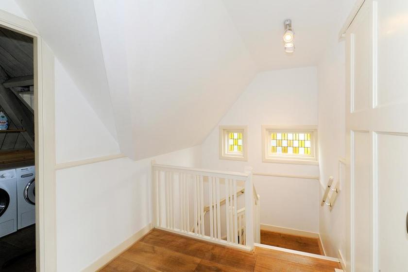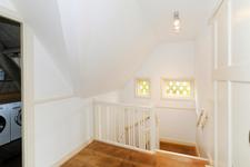 Overloop(je) met toegang tot een vaste trap naar de zolder. Knusse/spannende/onverwachte slaapkamer met twee vaste kasten en twee dakramen.