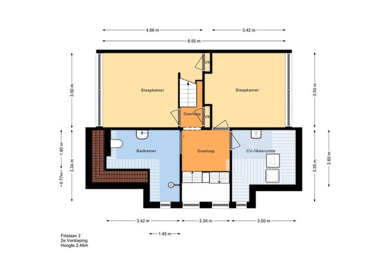 TWEEDE VERDIEPING Overloop. Twee slaapkamers met een goede maatvoering, beide voorzien van een vaste kast. Ruime badkamer met inloopdouche, vaste wastafel en wc. Aparte was-/stookruimte met opstelplaats wasmachine, -droger en cv-ketel (Remeha 2020).