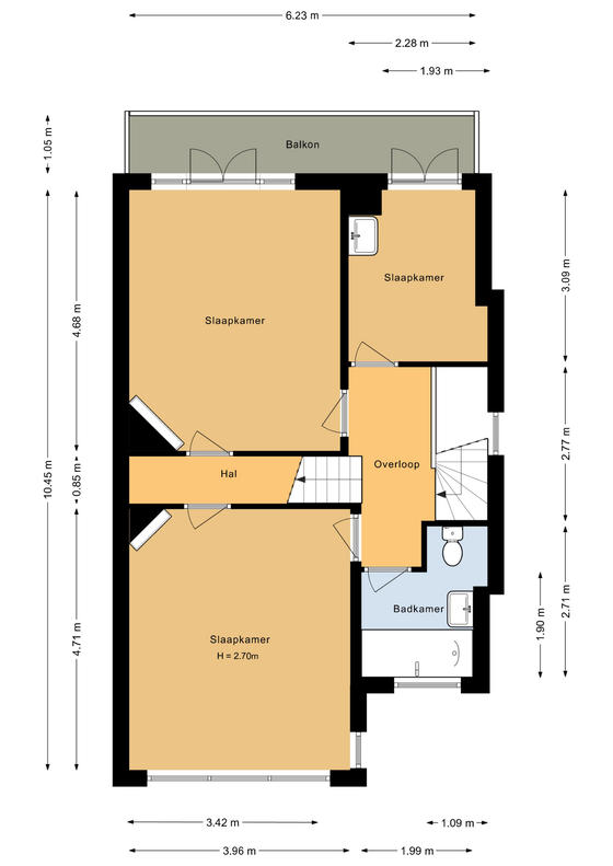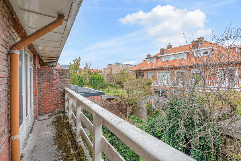 Lichte overloop. Aan de voorzijde slaapkamer 1, een mooie kamer met vrij uitzicht op het plantsoen/plein. Aan de achterzijde slaapkamer 2 en 3. Beide kamers hebben openslaande deuren naar het woning-brede balkon. De gedateerde badkamer ligt aan de voorzijde.