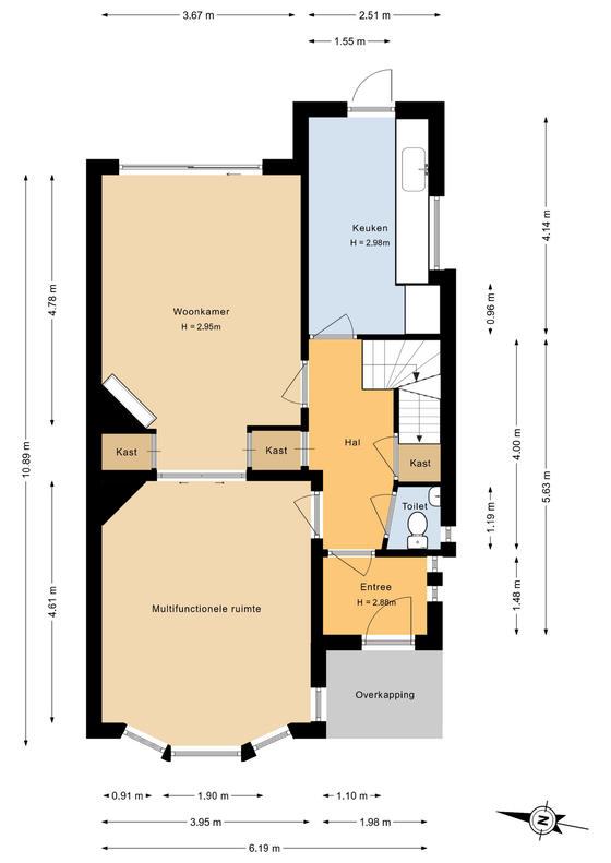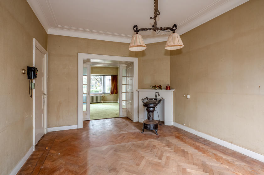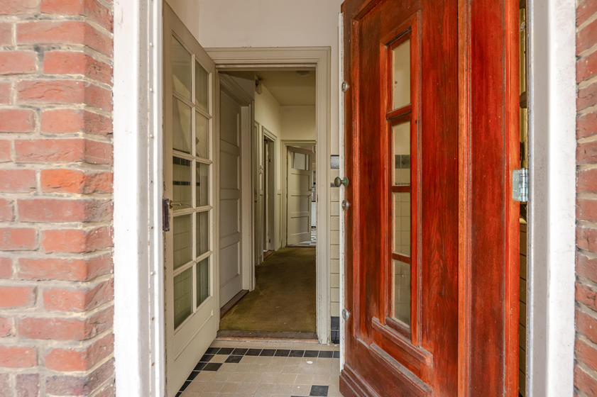 Fraaie voordeur, vestibule met twee zijramen, vestibuledeur, binnenhal met de wc-ruimte, een vaste kast en de kelderdeur. De hal vangt goed licht via de ramen in het trappenhuis. Twee woonkamers en suite met een kastenseparatie met schuifdeuren: de voorkamer biedt zicht op de zij-/voortuin en het plantsoen, de achterkamer heeft openslaande deuren naar de achtertuin. Aan de achterzijde is de keukenruimte met een deur naar de achtertuin.