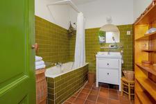 Aan tuinzijde eveneens een goed formaat slaapkamer met een hoekkast en openslaande deuren naar de serre met een fraaie deurpartij en glas-in-loodramen. De keuken/badkamer is eenvoudig ingericht en bereikbaar via de overloop en met openslaande deuren serre.