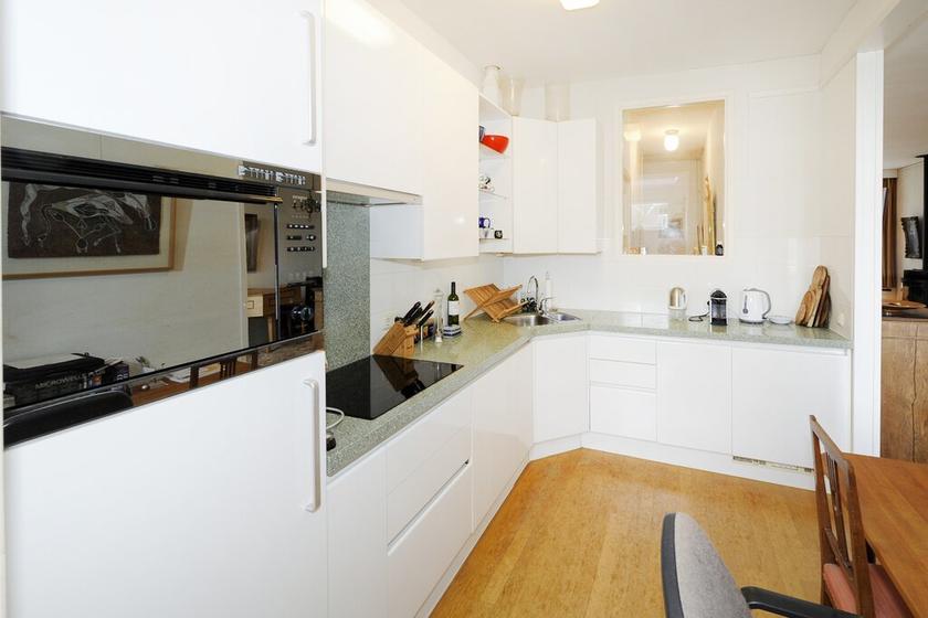 EERSTE VERDIEPING Vanuit de entreehal een trap naar de overloop op de eerste etage met toegang tot de wc. L-vormige, doorgebroken woon-/eetkamer met een houtkachel en visgraatparketvloer. Doorgang naar keuken in L-vormige opstelling met diverse inbouwapparatuur en bijkeuken met daklicht en deur naar het terras.