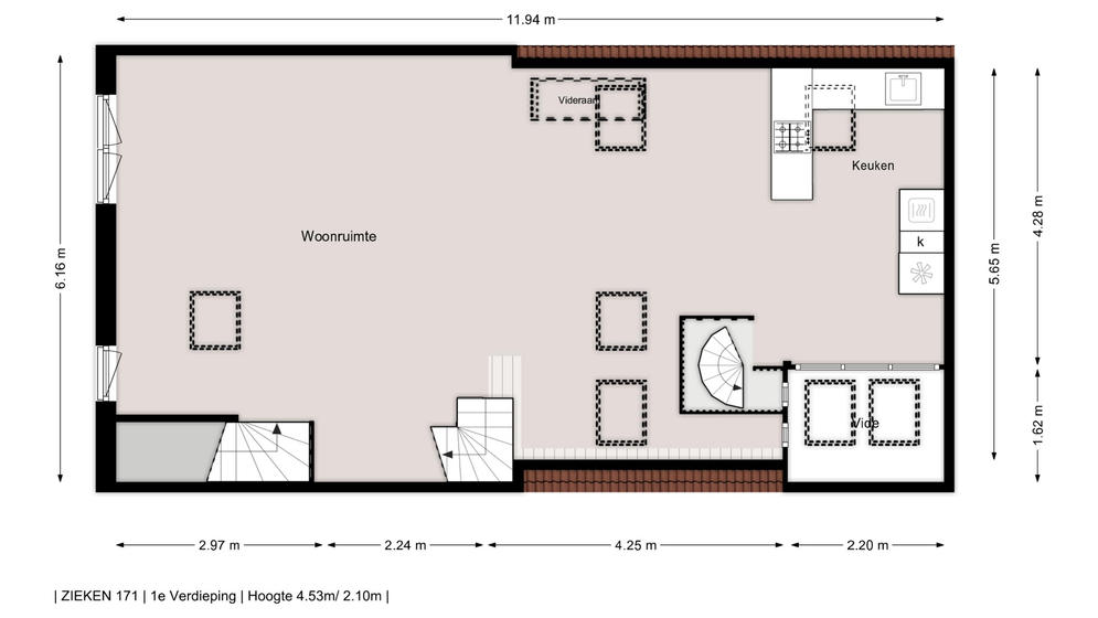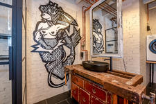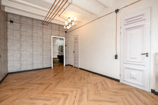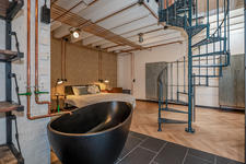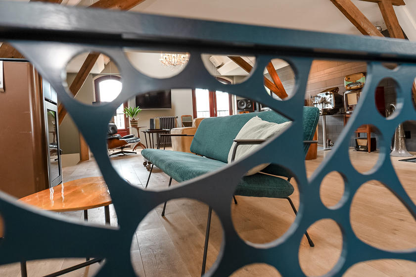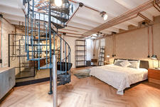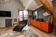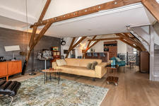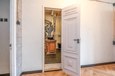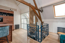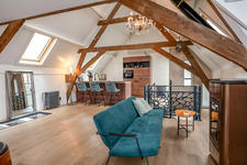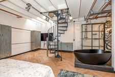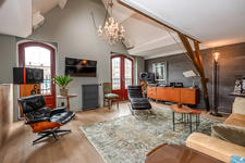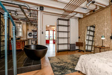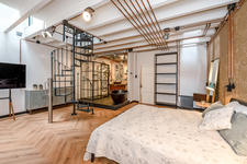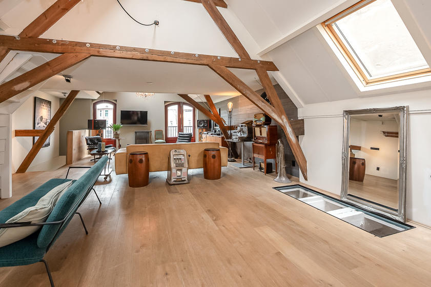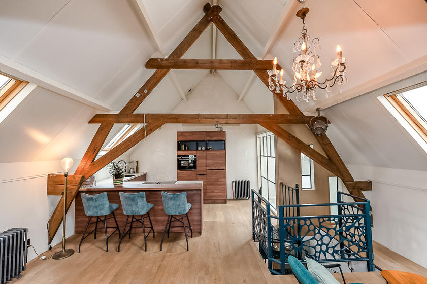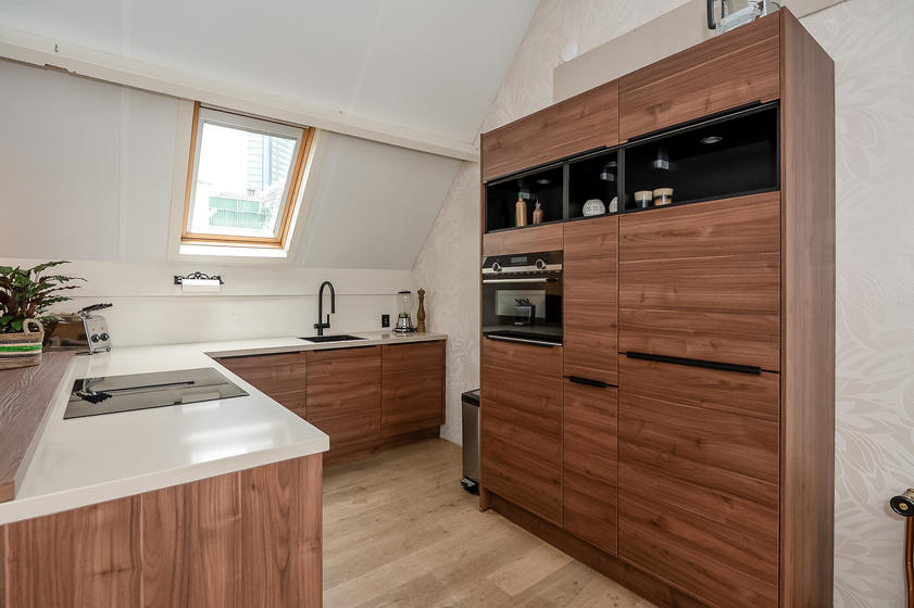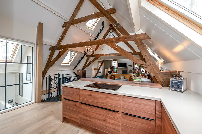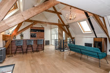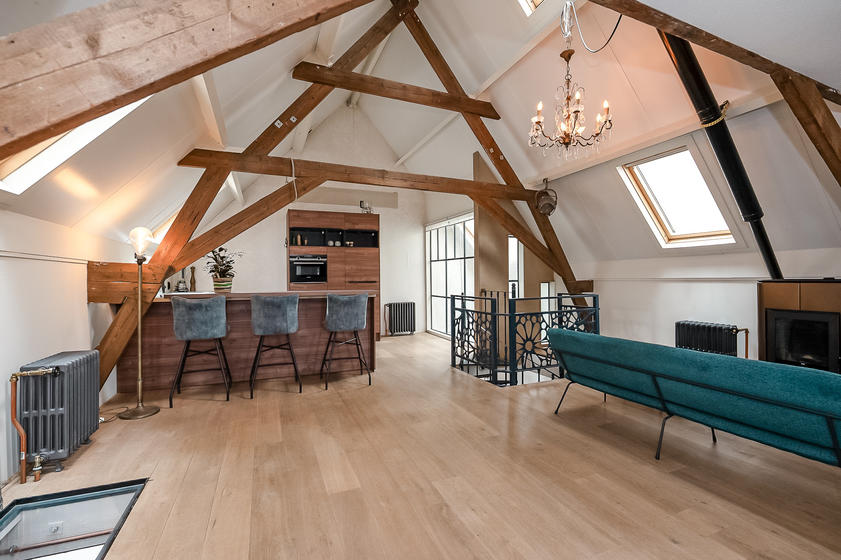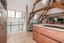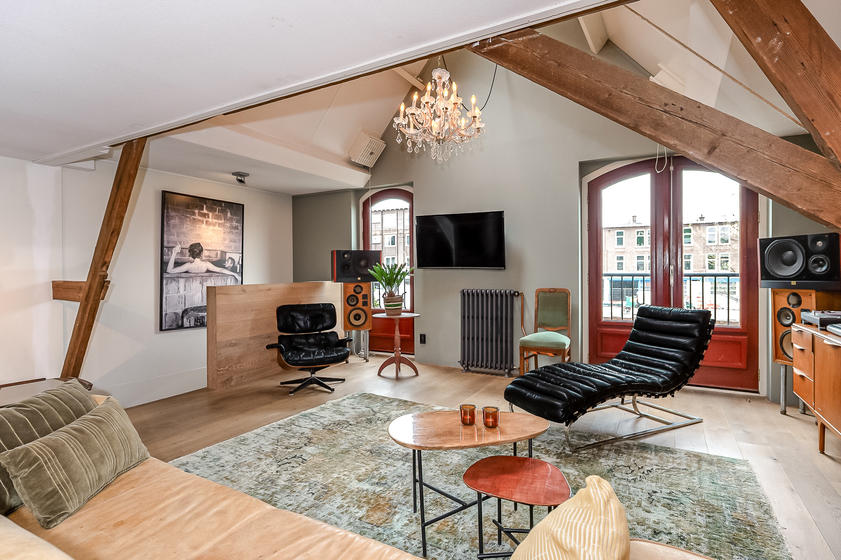 Zeer grote en spectaculaire woon-/eetkamer (toegankelijk via trap achter voordeur en via de wenteltrap vanuit de slaapkamer) met een Frans balkon en een open keuken. Het Franse balkon biedt fraai uitzicht over de gracht en een maximum aan privacy. De luxe keukenopstelling is voorzien van diverse apparatuur en een eetbar. De vide aan de achterzijde en diverse dakramen zorgen voor lichtinval. Vloerdecoratie: houten vloerdelen.